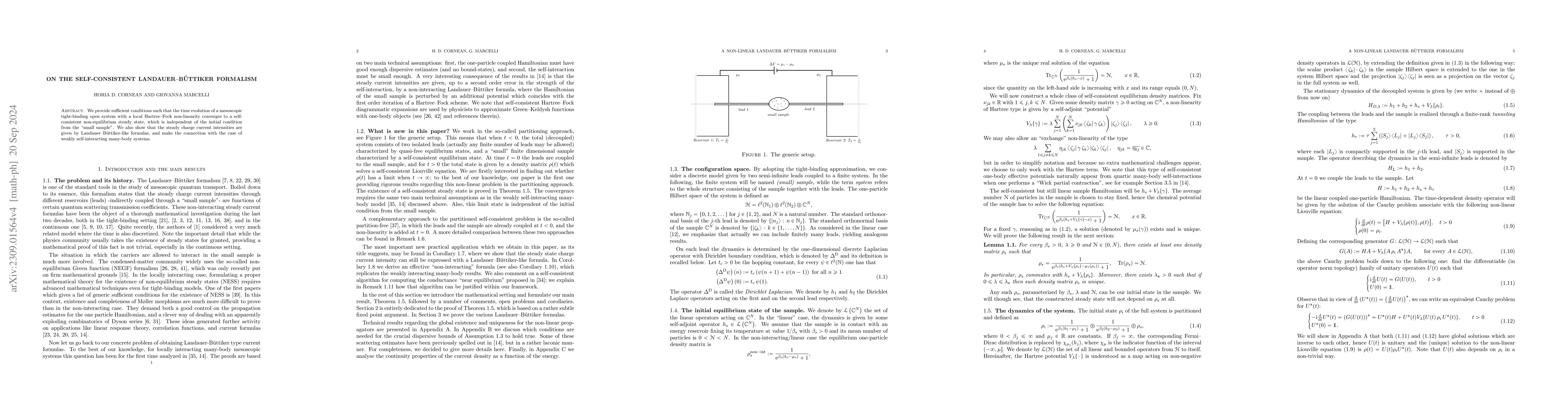 This paper establishes conditions for mesoscopic systems with local Hartree-Fock non-linearity to reach a self-consistent non-equilibrium steady state, independent of initial conditions. It also demonstrates that steady charge currents conform to Landauer-Büttiker-like formulas, linking these findings to weakly self-interacting many-body systems.