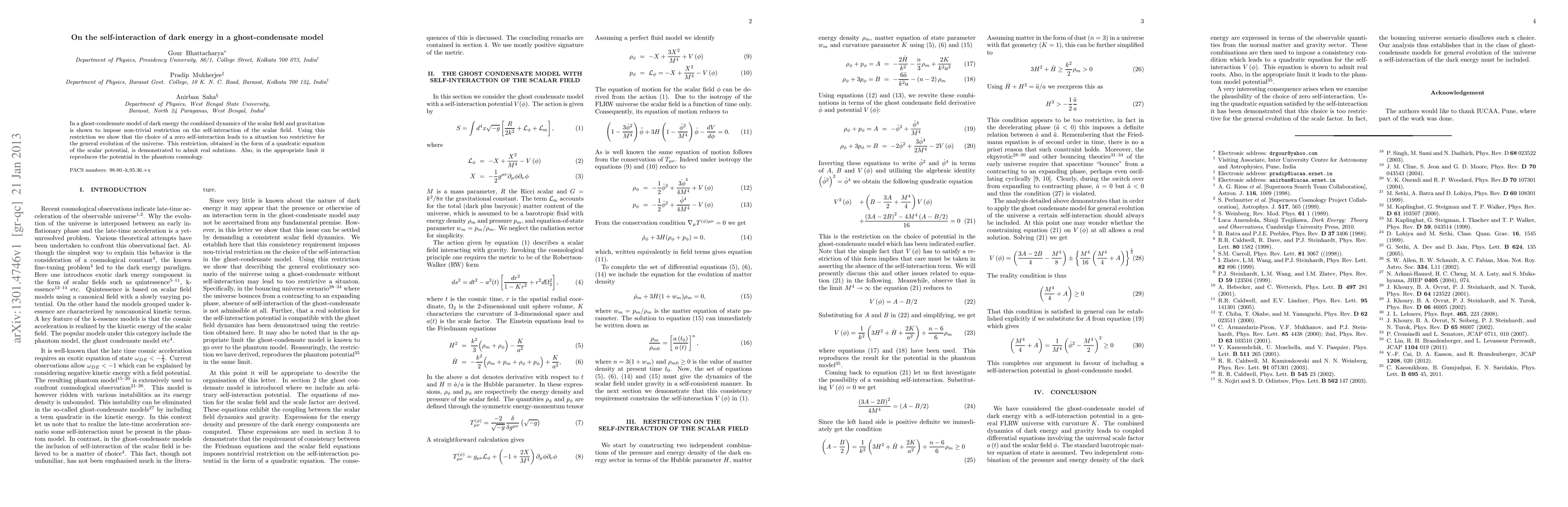 Researchers study how dark energy interacts with itself in a ghost-condensate model and find that a zero self-interaction is too restrictive for the universe's evolution. The study reveals real solutions to a quadratic equation that describes the scalar potential in this scenario.