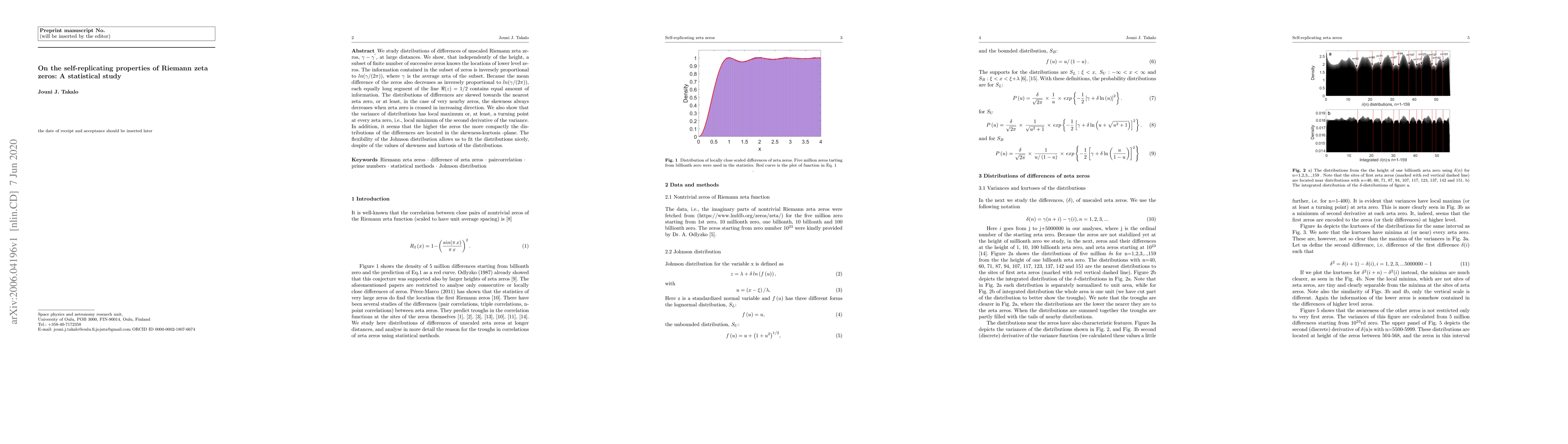 We study distributions of differences of unscaled Riemann zeta zeros, $\gamma-\gamma^{'}$, at large distances. We show, that independently of the height, a subset of finite number of successive zeros knows the locations of lower level zeros. The information contained in the subset of zeros is inversely proportional to $ln(\gamma/(2\pi))$, where $\gamma$ is the average zeta of the subset. Because the mean difference of the zeros also decreases as inversely proportional to $ln(\gamma/(2\pi))$, each equally long segment of the line $\Re(z)=1/2$ contains equal amount of information. The distributions of differences are skewed towards the nearest zeta zero, or at least, in the case of very nearby zeros, the skewness always decreases when zeta zero is crossed in increasing direction. We also show that the variance of distributions has local maximum or, at least, a turning point at every zeta zero, i.e., local minimum of the second derivative of the variance. In addition, it seems that the higher the zeros the more compactly the distributions of the differences are located in the skewness-kurtosis -plane. The flexibility of the Johnson distribution allows us to fit the distributions nicely, despite of the values of skewness and kurtosis of the distributions.