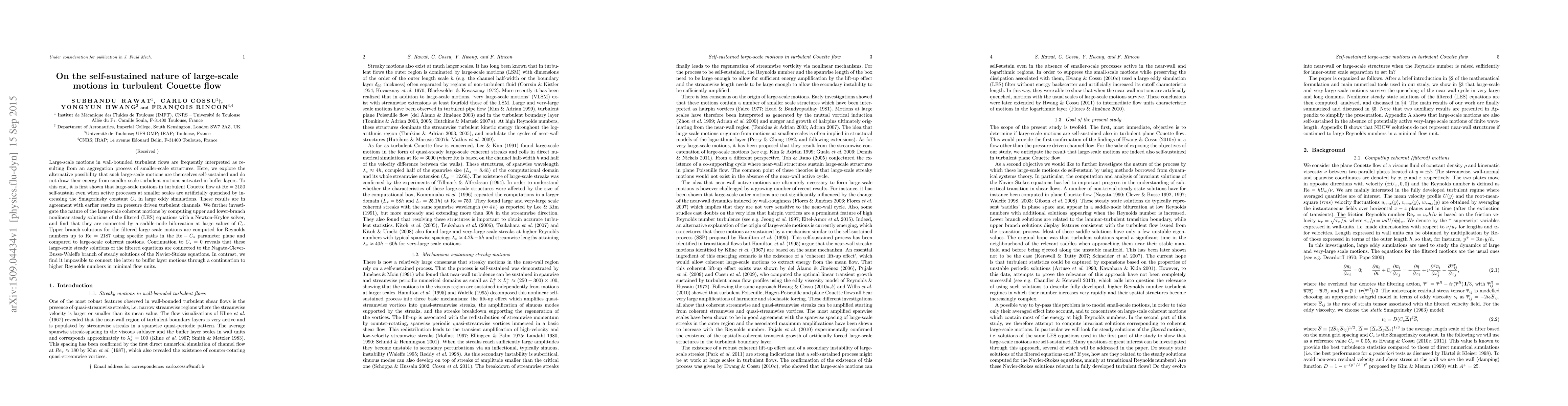 This paper investigates the self-sustained nature of large-scale motions in turbulent Couette flow, demonstrating that these large-scale motions can persist even when smaller-scale turbulent processes are suppressed. It finds that these large-scale coherent motions are linked to steady solutions via a saddle-node bifurcation and are not dependent on buffer layer turbulence.