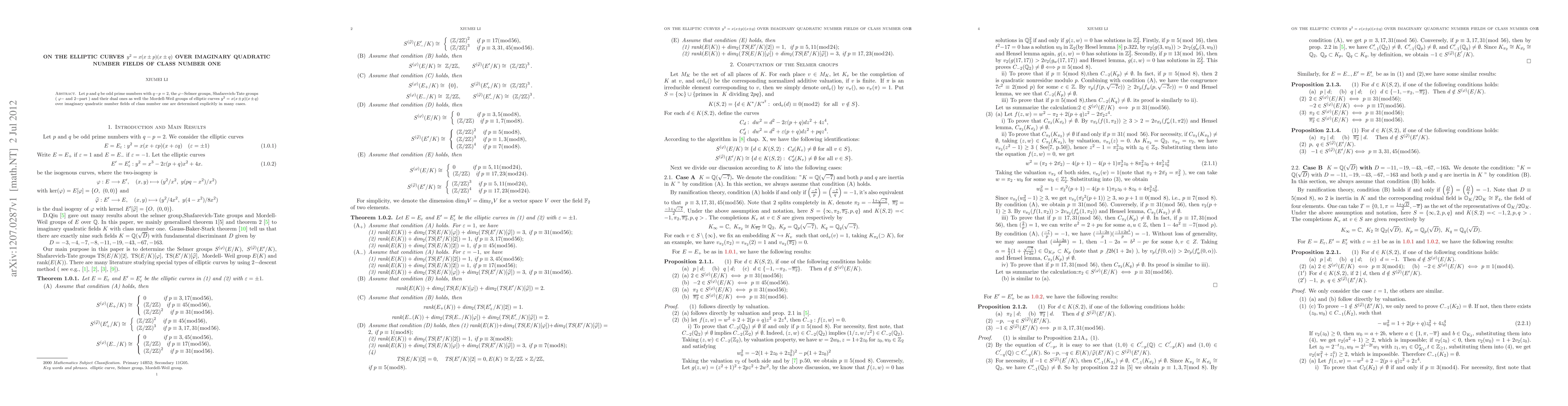 Let $ p $ and $ q $ be odd prime numbers with $ q - p = 2, $ the $\varphi -$Selmer groups, Shafarevich-Tate groups ($ \varphi - $ and $ 2-$part) and their dual ones as well the Mordell-Weil groups of elliptic curves $ y^{2} = x (x \pm p) (x \pm q) $ over imaginary quadratic number fields of class number one are determined explicitly in many cases.