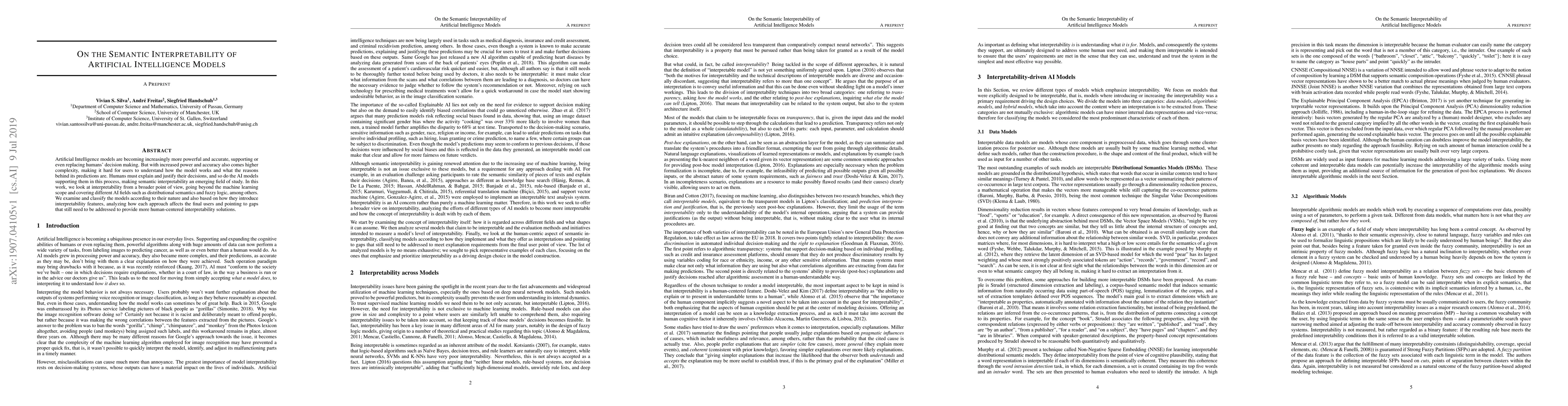 Artificial Intelligence models are becoming increasingly more powerful and accurate, supporting or even replacing humans' decision making. But with increased power and accuracy also comes higher complexity, making it hard for users to understand how the model works and what the reasons behind its predictions are. Humans must explain and justify their decisions, and so do the AI models supporting them in this process, making semantic interpretability an emerging field of study. In this work, we look at interpretability from a broader point of view, going beyond the machine learning scope and covering different AI fields such as distributional semantics and fuzzy logic, among others. We examine and classify the models according to their nature and also based on how they introduce interpretability features, analyzing how each approach affects the final users and pointing to gaps that still need to be addressed to provide more human-centered interpretability solutions.