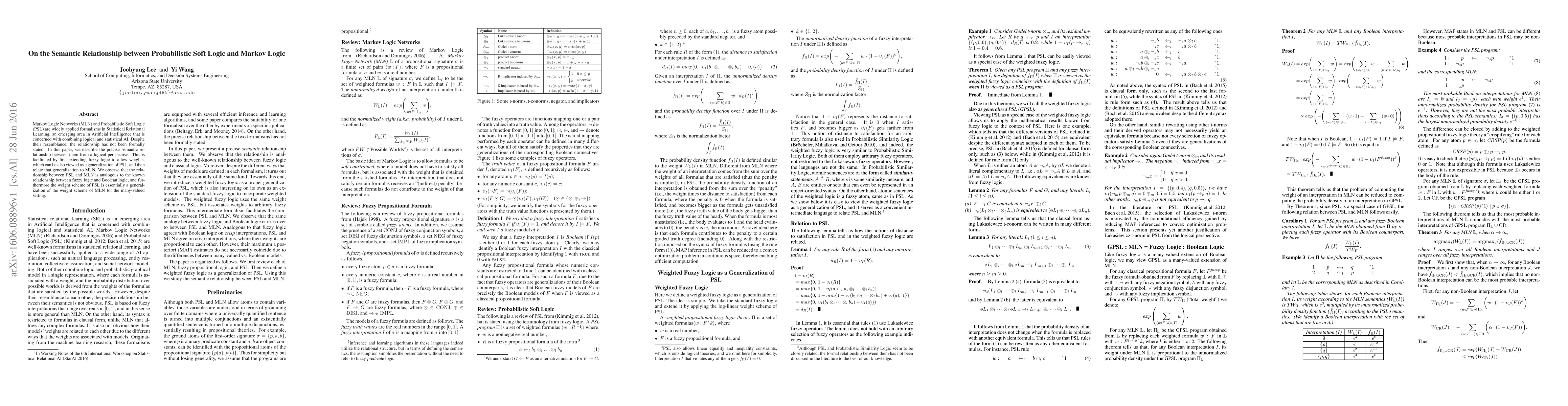 This paper formally establishes the semantic relationship between Probabilistic Soft Logic (PSL) and Markov Logic Networks (MLN) by extending fuzzy logic to incorporate weights, showing that PSL generalizes MLN in a many-valued setting akin to how fuzzy logic generalizes Boolean logic.