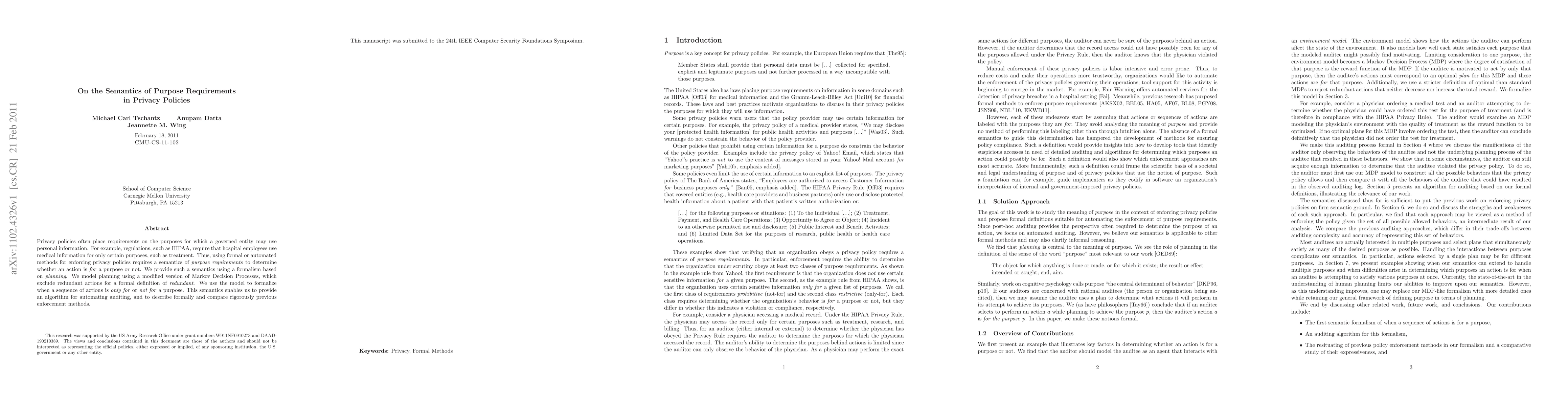 Privacy policies often place requirements on the purposes for which a governed entity may use personal information. For example, regulations, such as HIPAA, require that hospital employees use medical information for only certain purposes, such as treatment. Thus, using formal or automated methods for enforcing privacy policies requires a semantics of purpose requirements to determine whether an action is for a purpose or not. We provide such a semantics using a formalism based on planning. We model planning using a modified version of Markov Decision Processes, which exclude redundant actions for a formal definition of redundant. We use the model to formalize when a sequence of actions is only for or not for a purpose. This semantics enables us to provide an algorithm for automating auditing, and to describe formally and compare rigorously previous enforcement methods.