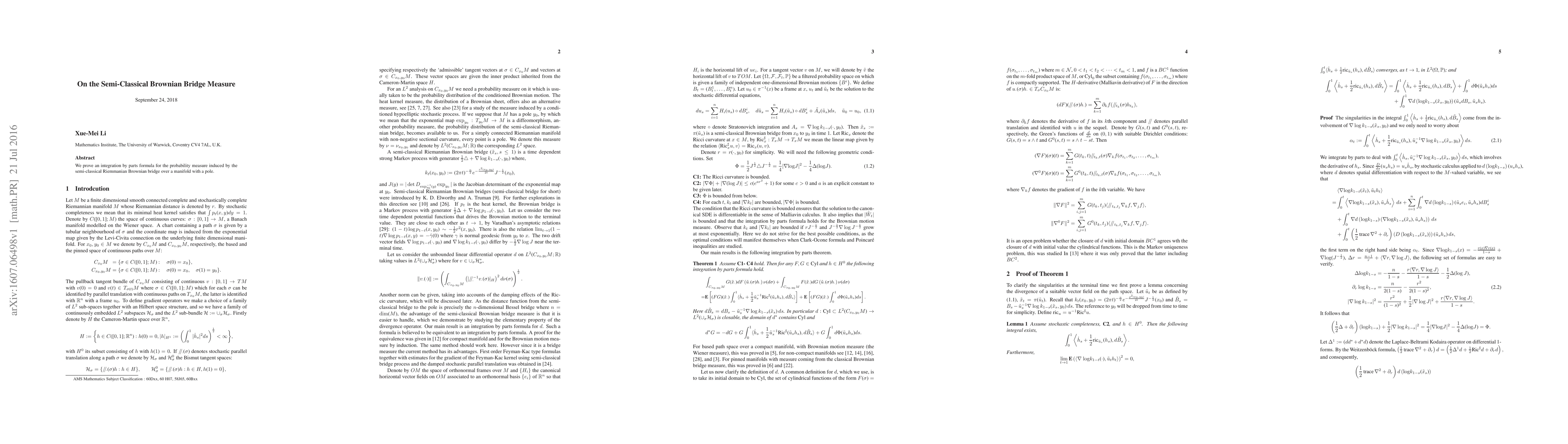 The paper presents a novel integration by parts formula for the semi-classical Brownian bridge measure on manifolds with a pole, along with detailed proofs and technical lemmas.