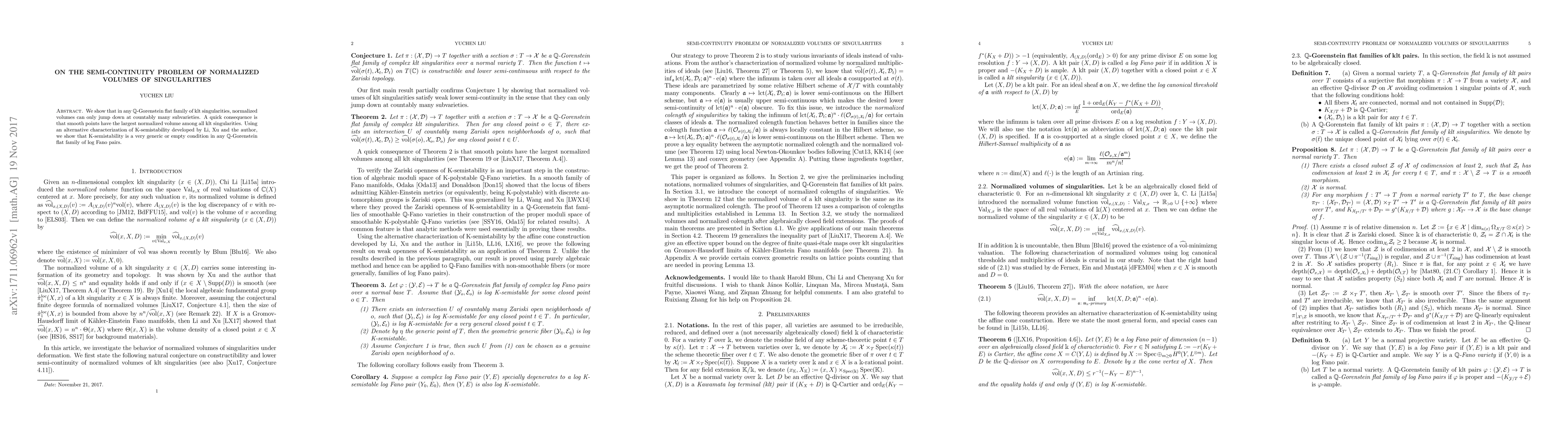 We show that in any $\mathbb{Q}$-Gorenstein flat family of klt singularities, normalized volumes can only jump down at countably many subvarieties. A quick consequence is that smooth points have the largest normalized volume among all klt singularities. Using an alternative characterization of K-semistability developed by Li, Xu and the author, we show that K-semistability is a very generic or empty condition in any $\mathbb{Q}$-Gorenstein flat family of log Fano pairs.