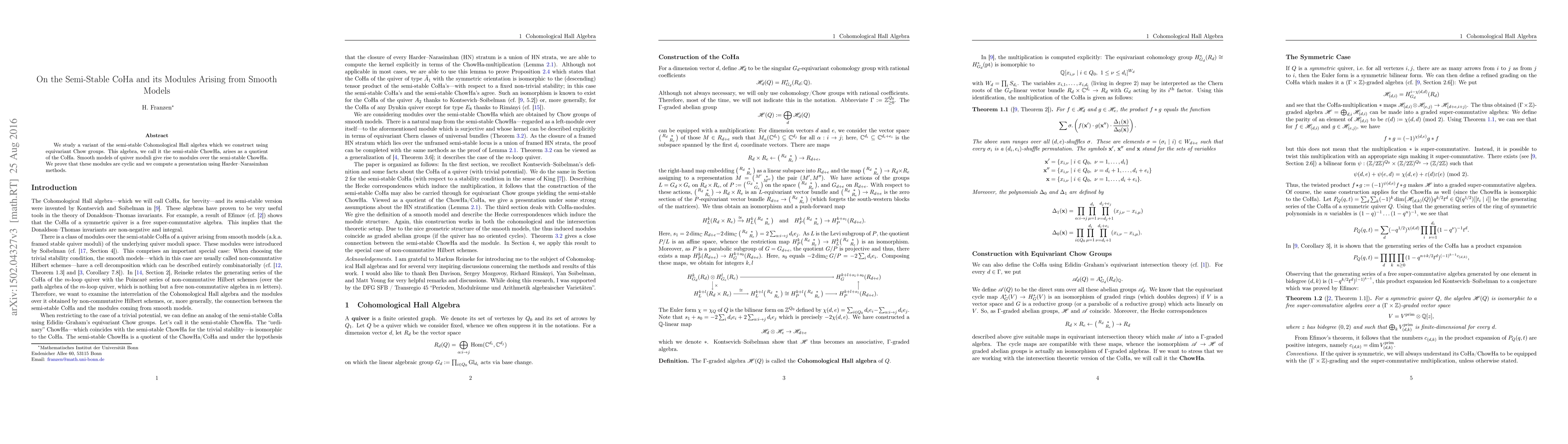 Summary: This paper constructs a semi-stable variant of the Cohomological Hall algebra using equivariant Chow groups, termed the semi-stable ChowHa, which emerges from smooth models of quiver moduli. The study proves that modules from these models are cyclic and provides a presentation for them using Harder-Narasimhan techniques.