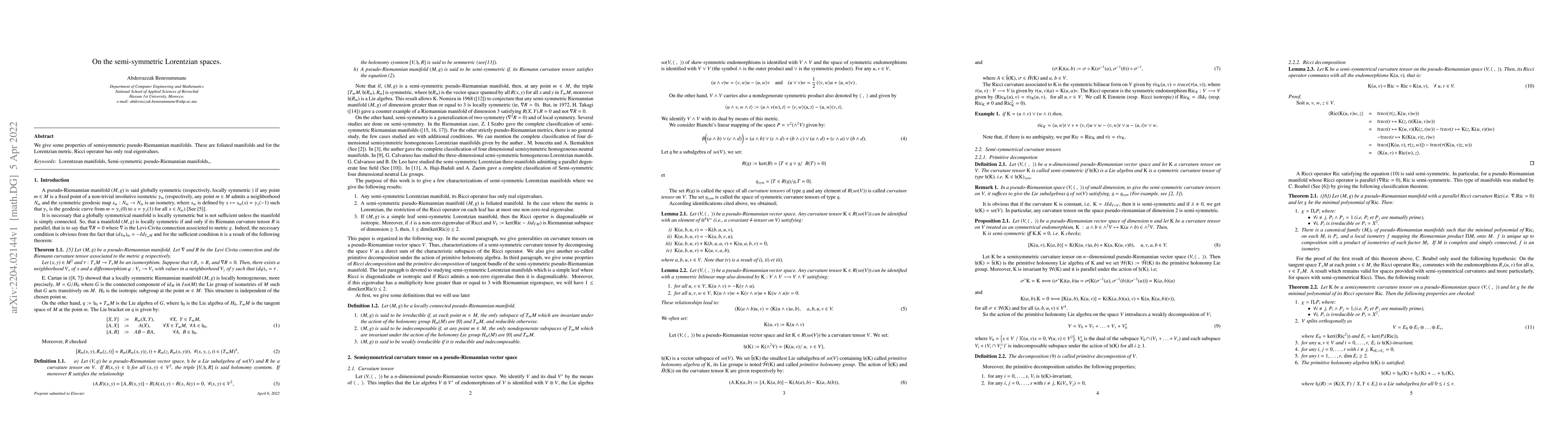 Summary: This paper explores properties of semi-symmetric pseudo-Riemannian manifolds, specifically their foliation structure and the characteristic that the Ricci operator under a Lorentzian metric possesses only real eigenvalues.