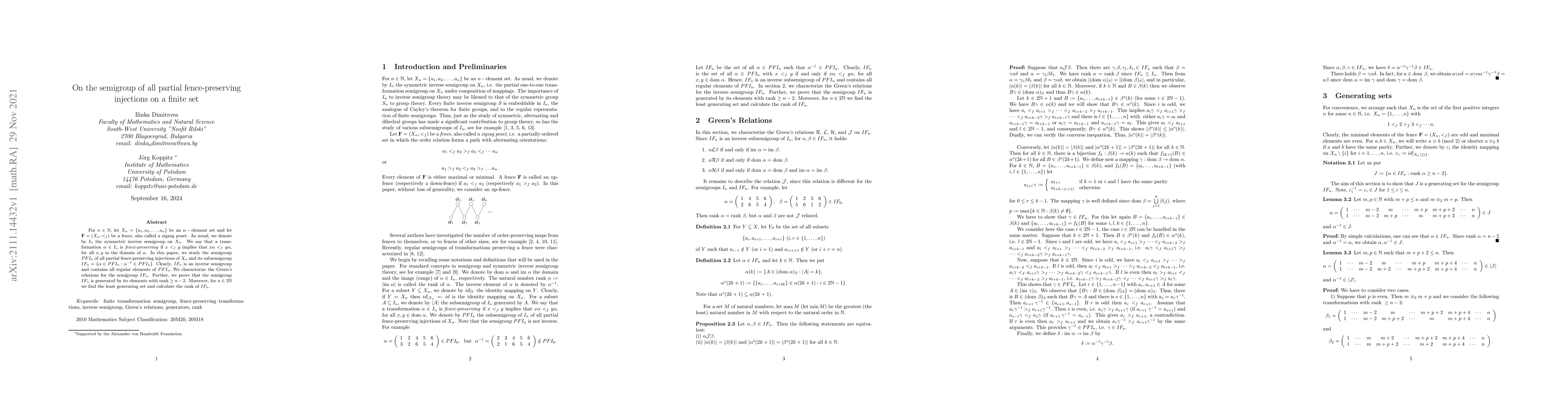 The paper studies semigroups of partial fence-preserving injections on finite sets, focusing on characterization of Green's relations, generating sets, and ranks for specific cases.