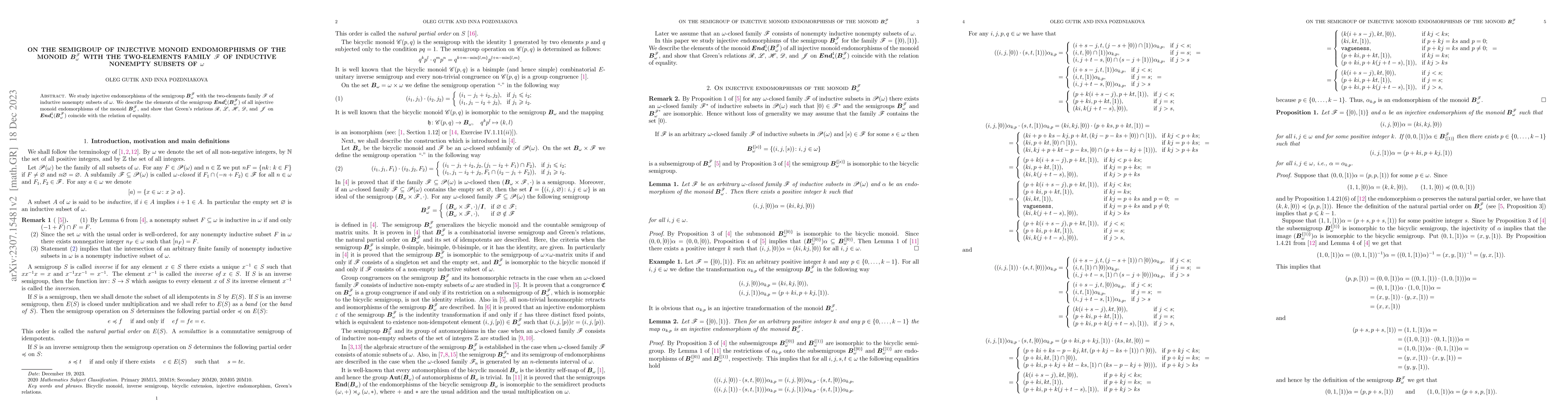 This paper investigates injective endomorphisms of the semigroup $\boldsymbol{B}_{\omega}^{\mathscr{F}}$, characterized by a two-element family of inductive nonempty subsets. It demonstrates that all injective monoid endomorphisms in $\boldsymbol{End}^1_*(\boldsymbol{B}_{\omega}^{\mathscr{F}})$ are essentially equal under Green's relations $\mathscr{R}$, $\mathscr{L}$, $\mathscr{H}$, $\mathscr{D}$, and $\mathscr{J}$.
