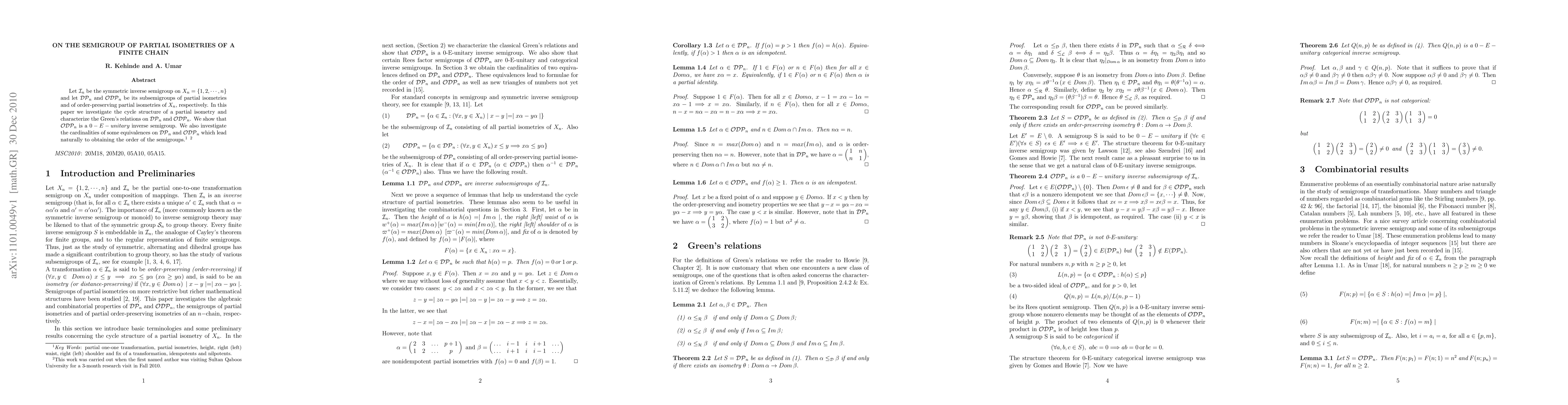 Let ${\cal I}_n$ be the symmetric inverse semigroup on $X_n = \{1, 2,..., n\}$ and let ${\cal DP}_n$ and ${\cal ODP}_n$ be its subsemigroups of partial isometries and of order-preserving partial isometries of $X_n$, respectively. In this paper we investigate the cycle structure of a partial isometry and characterize the Green's relations on ${\cal DP}_n$ and ${\cal ODP}_n$. We show that ${\cal ODP}_n$ is a $0-E-unitary$ inverse semigroup. We also investigate the cardinalities of some equivalences on ${\cal DP}_n$ and ${\cal ODP}_n$ which lead naturally to obtaining the order of the semigroups.