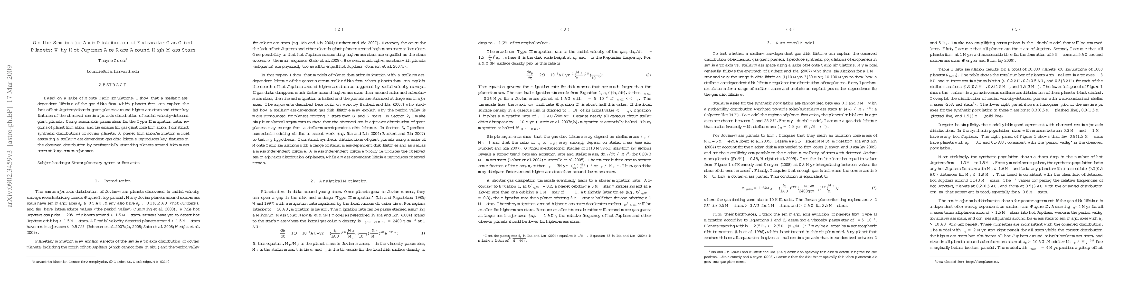A study using Monte Carlo simulations suggests that gas disks from which planets form have a shorter lifetime for high-mass stars, explaining why hot Jupiters are rare around these stars.