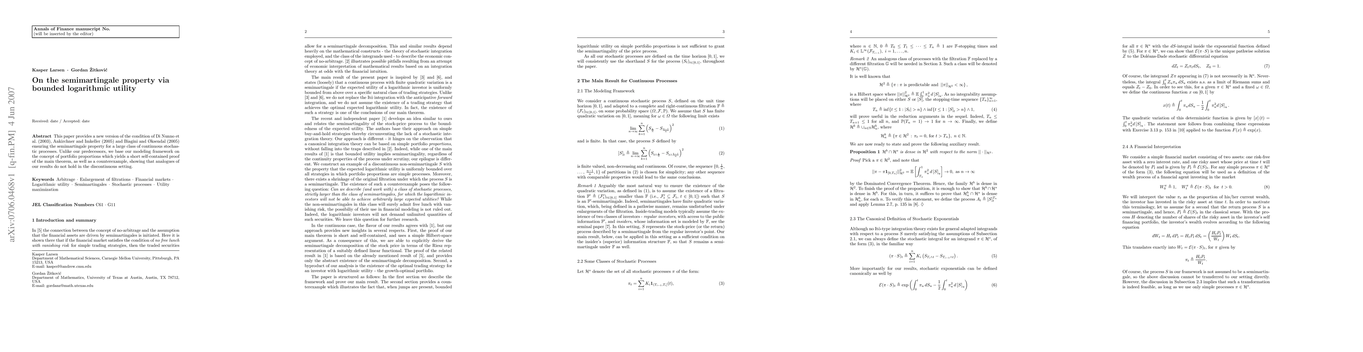 This paper introduces a new condition for the semimartingale property based on portfolio proportions, providing a concise proof and demonstrating that the results do not extend to discontinuous processes. The approach differs from previous works by Di Nunno et al., Ankirchner and Imkeller, and Biagini and Øksendal.