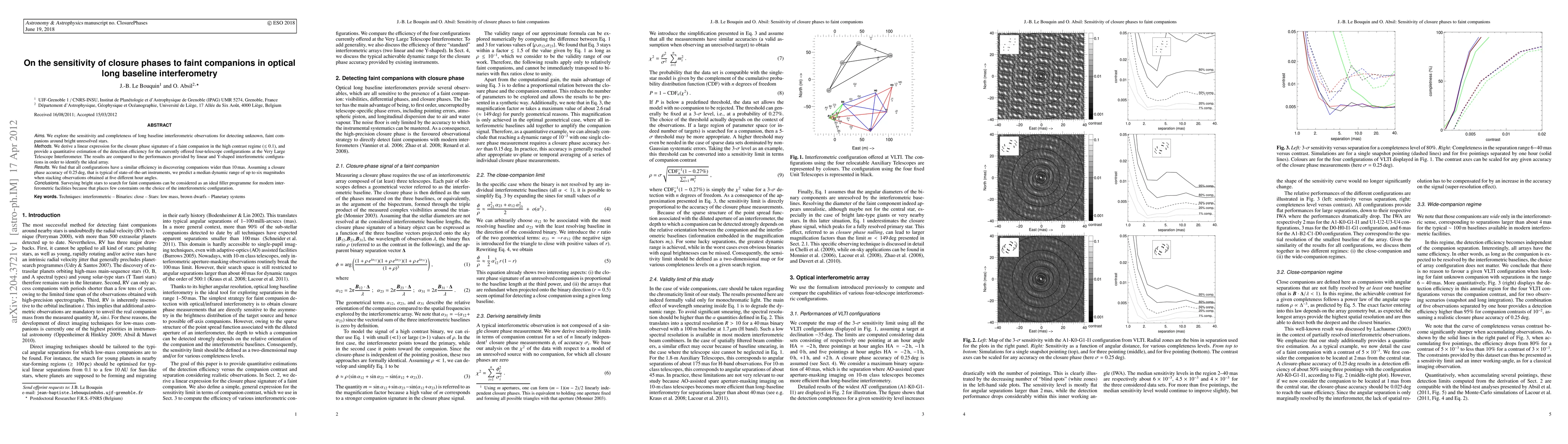 This paper investigates the sensitivity of long baseline interferometry to detect faint companions around bright stars, deriving a linear expression for closure phase signatures and comparing detection efficiencies across different interferometric configurations. It concludes that all configurations are similarly effective for companions wider than 10 mas, with a median dynamic range of up to six magnitudes.