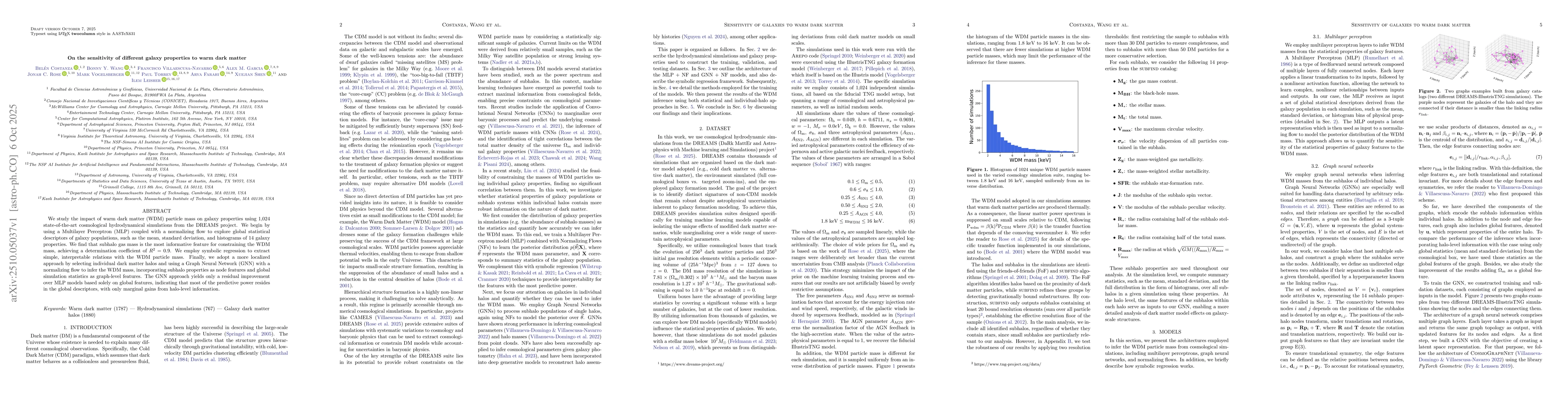 We study the impact of warm dark matter (WDM) particle mass on galaxy properties using 1,024 state-of-the-art cosmological hydrodynamical simulations from the DREAMS project. We begin by using a Multilayer Perceptron (MLP) coupled with a normalizing flow to explore global statistical descriptors of galaxy populations, such as the mean, standard deviation, and histograms of 14 galaxy properties. We find that subhalo gas mass is the most informative feature for constraining the WDM mass, achieving a determination coefficient of R^2 = 0.9. We employ symbolic regression to extract simple, interpretable relations with the WDM particle mass. Finally, we adopt a more localized approach by selecting individual dark matter halos and using a Graph Neural Network (GNN) with a normalizing flow to infer the WDM mass, incorporating subhalo properties as node features and global simulation statistics as graph-level features. The GNN approach yields only a residual improvement over MLP models based solely on global features, indicating that most of the predictive power resides in the global descriptors, with only marginal gains from halo-level information.