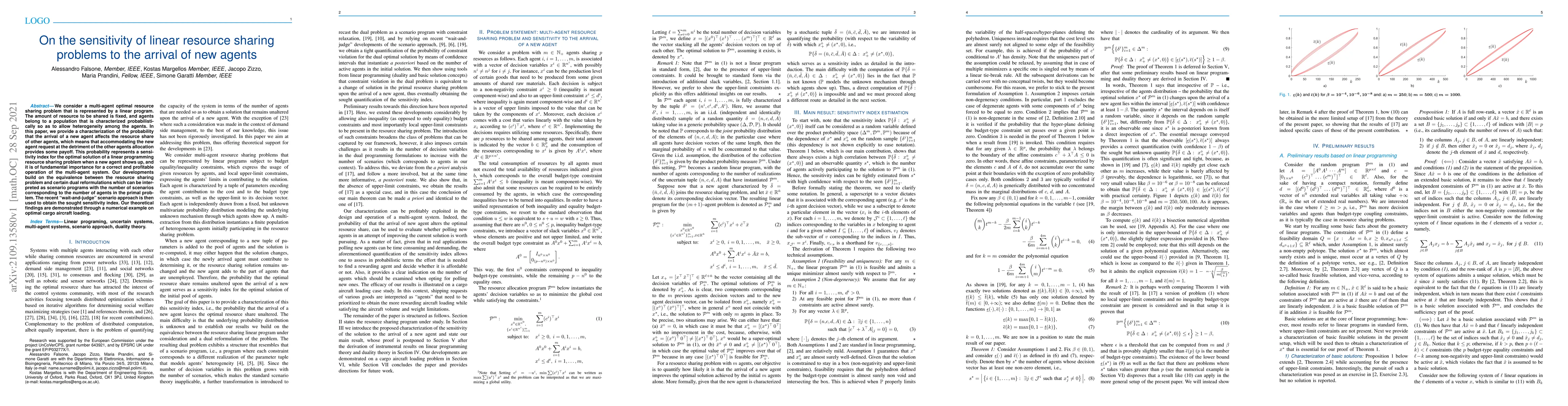 A new study characterizes the probability that a new agent affects the resource share of existing agents in a multi-agent system, providing insights into the sensitivity of linear resource sharing problems. The findings have implications for efficient operation of multi-agent systems, particularly in cargo aircraft loading scenarios.