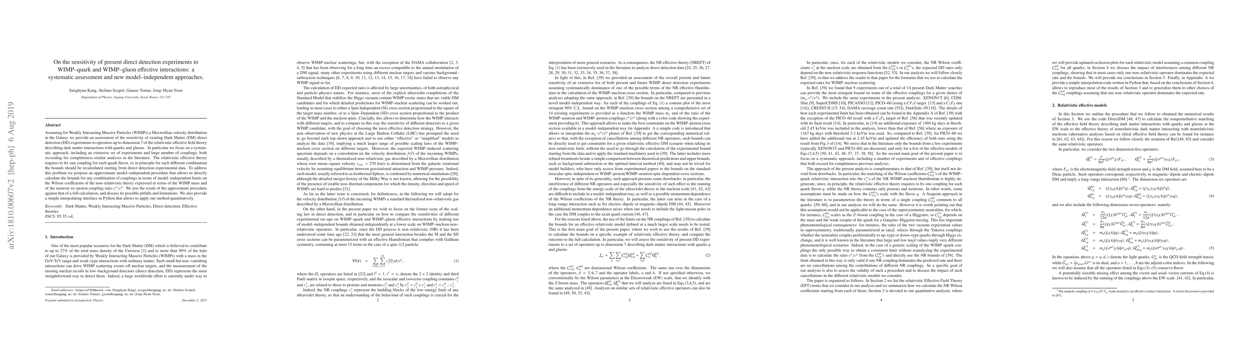 Assuming for Weakly Interacting Massive Particles (WIMPs) a Maxwellian velocity distribution in the Galaxy we provide an assessment of the sensitivity of existing Dark Matter (DM) direct detection (DD) experiments to operators up to dimension 7 of the relativistic effective field theory describing dark matter interactions with quarks and gluons . In particular we focus on a systematic approach, including an extensive set of experiments and large number of couplings, both exceeding for completeness similar analyses in the literature. The relativistic effective theory requires to fix one coupling for each quark flavor, so in principle for each different combination the bounds should be recalculated starting from direct detection experimental data. To address this problem we propose an approximate model-independent procedure that allows to directly calculate the bounds for any combination of couplings in terms of model-independent limits on the Wilson coefficients of the non-relativistic theory expressed in terms of the WIMP mass and of the neutron-to-proton coupling ratio $c^n/c^p$. We test the result of the approximate procedure against that of a full calculation, and discuss its possible pitfalls and limitations. We also provide a simple interpolating interface in Python that allows to apply our method quantitatively.