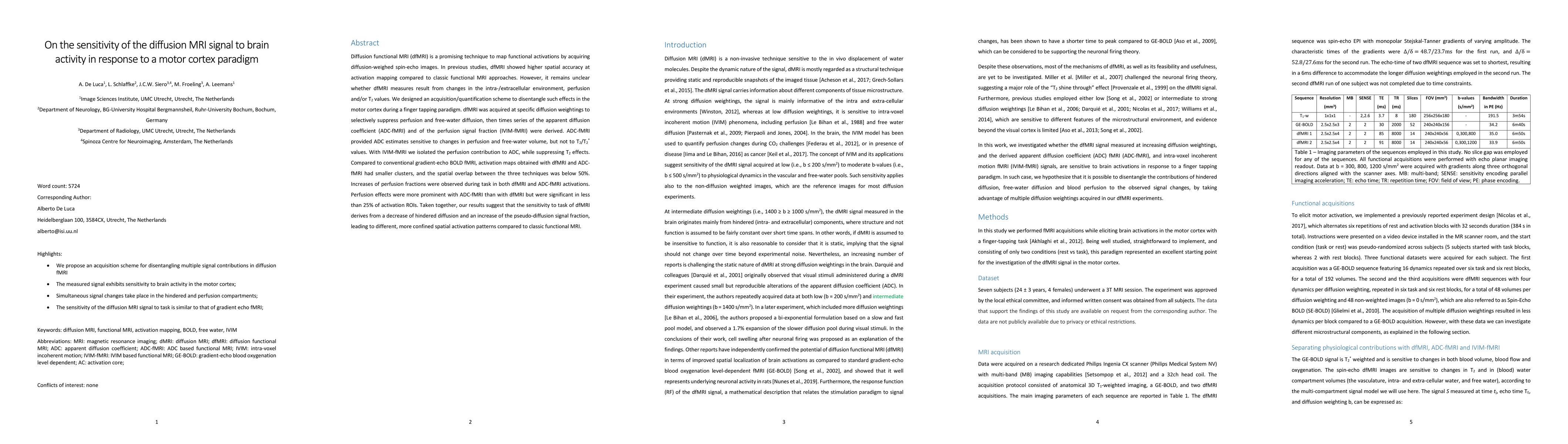 Diffusion functional MRI (dfMRI) is a promising technique to map functional activations by acquiring diffusion-weighed spin-echo images. In previous studies, dfMRI showed higher spatial accuracy at activation mapping compared to classic functional MRI approaches. However, it remains unclear whether dfMRI measures result from changes in the intra-/extracellular environment, perfusion and/or T2 values. We designed an acquisition/quantification scheme to disentangle such effects in the motor cortex during a finger tapping paradigm. dfMRI was acquired at specific diffusion weightings to selectively suppress perfusion and free-water diffusion, then times series of the apparent diffusion coefficient (ADC-fMRI) and of the perfusion signal fraction (IVIM-fMRI) were derived. ADC-fMRI provided ADC estimates sensitive to changes in perfusion and free-water volume, but not to T2/T2* values. With IVIM-fMRI we isolated the perfusion contribution to ADC, while suppressing T2 effects. Compared to conventional gradient-echo BOLD fMRI, activation maps obtained with dfMRI and ADC-fMRI had smaller clusters, and the spatial overlap between the three techniques was below 50%. Increases of perfusion fractions were observed during task in both dfMRI and ADC-fMRI activations. Perfusion effects were more prominent with ADC-fMRI than with dfMRI but were significant in less than 25% of activation ROIs. Taken together, our results suggest that the sensitivity to task of dfMRI derives from a decrease of hindered diffusion and an increase of the pseudo-diffusion signal fraction, leading to different, more confined spatial activation patterns compared to classic functional MRI.