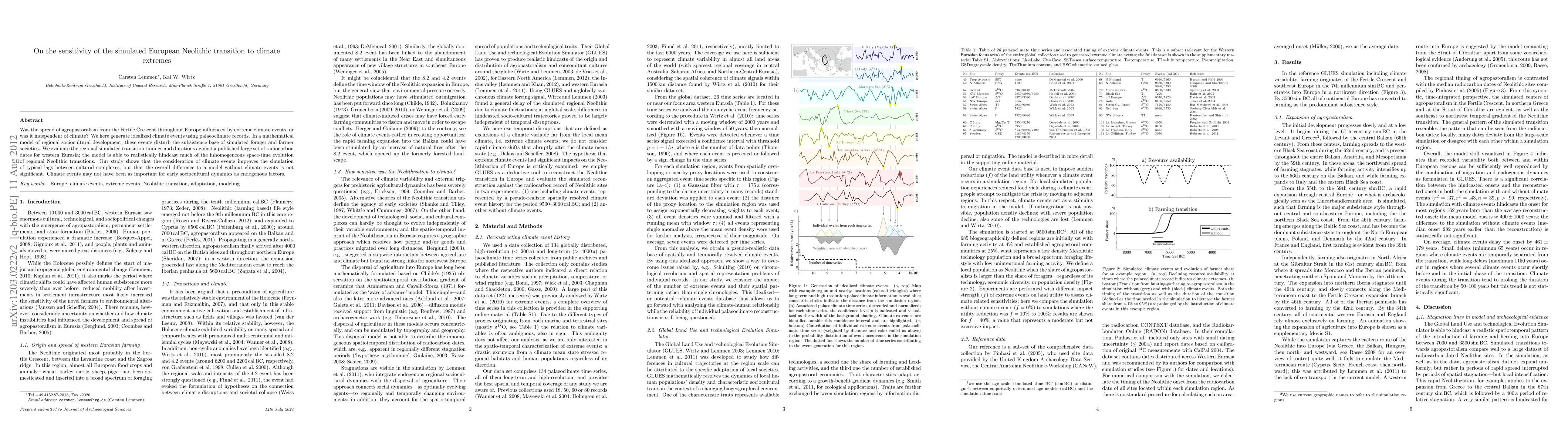 The study uses a mathematical model to simulate the spread of farming in Europe, introducing climate events from paleoclimate records. Results show that while climate events can explain some temporal lags in the Neolithic transition, they aren't significant drivers overall, suggesting endogenous factors might have played a larger role in this sociocultural shift.