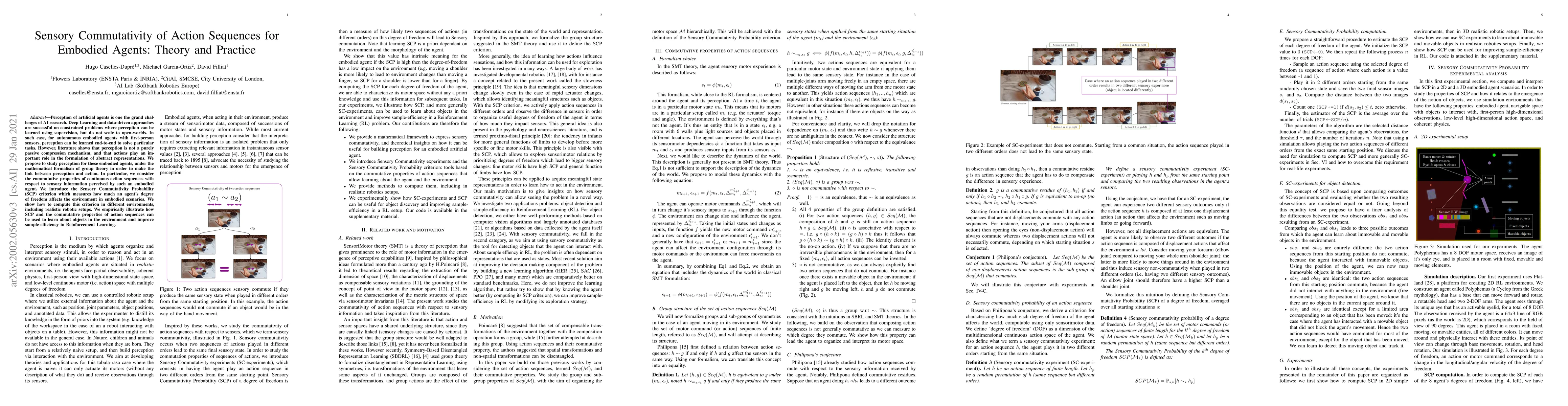 Perception of artificial agents is one the grand challenges of AI research. Deep Learning and data-driven approaches are successful on constrained problems where perception can be learned using supervision, but do not scale to open-worlds. In such case, for autonomous embodied agents with first-person sensors, perception can be learned end-to-end to solve particular tasks. However, literature shows that perception is not a purely passive compression mechanism, and that actions play an important role in the formulation of abstract representations. We propose to study perception for these embodied agents, under the mathematical formalism of group theory in order to make the link between perception and action. In particular, we consider the commutative properties of continuous action sequences with respect to sensory information perceived by such an embodied agent. We introduce the Sensory Commutativity Probability (SCP) criterion which measures how much an agent's degree of freedom affects the environment in embodied scenarios. We show how to compute this criterion in different environments, including realistic robotic setups. We empirically illustrate how SCP and the commutative properties of action sequences can be used to learn about objects in the environment and improve sample-efficiency in Reinforcement Learning.