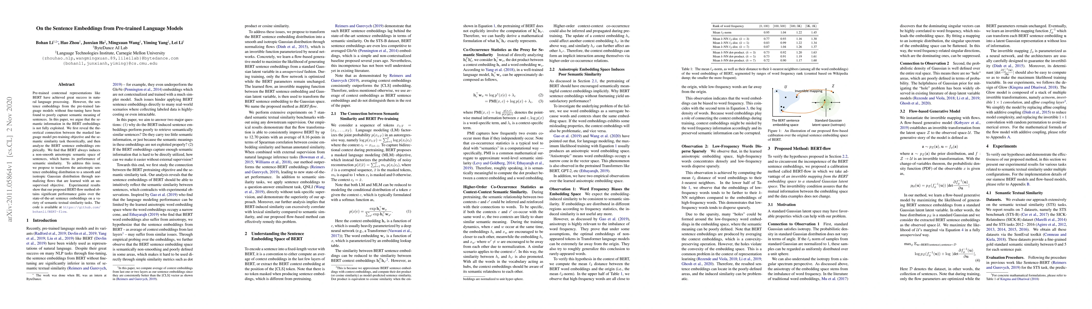The paper investigates the deficiency of BERT sentence embeddings on semantic textual similarity tasks and proposes a flow-based calibration method to enhance performance.