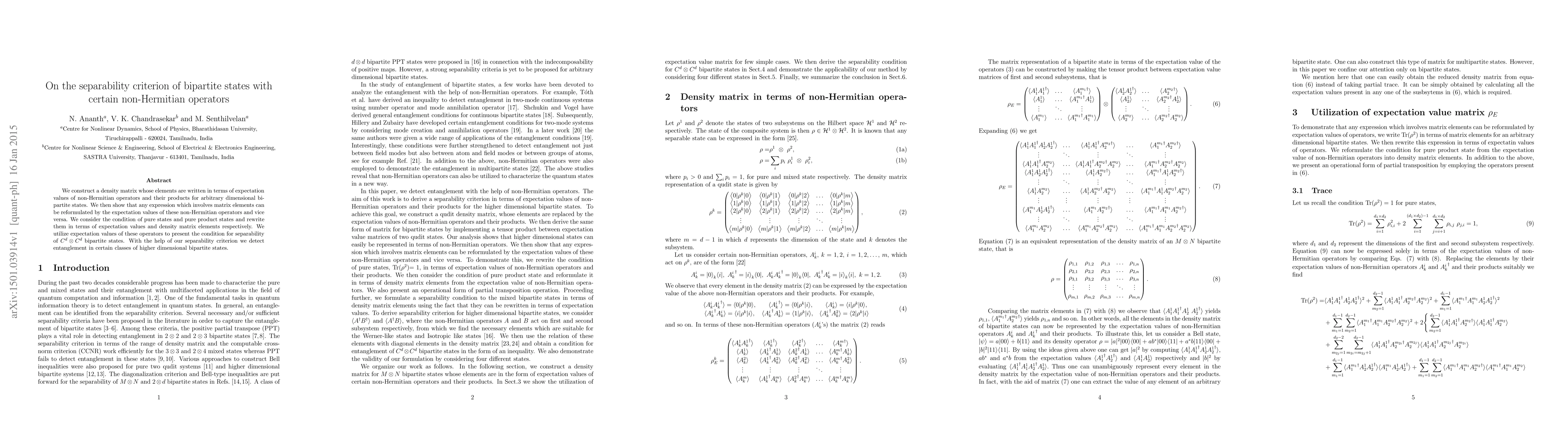 This paper constructs a density matrix using non-Hermitian operators to reformulate expressions involving matrix elements for bipartite states. The authors present a separability criterion for ${C}^d \otimes {C}^d$ bipartite states based on expectation values of these operators, enabling the detection of entanglement in higher dimensional systems.