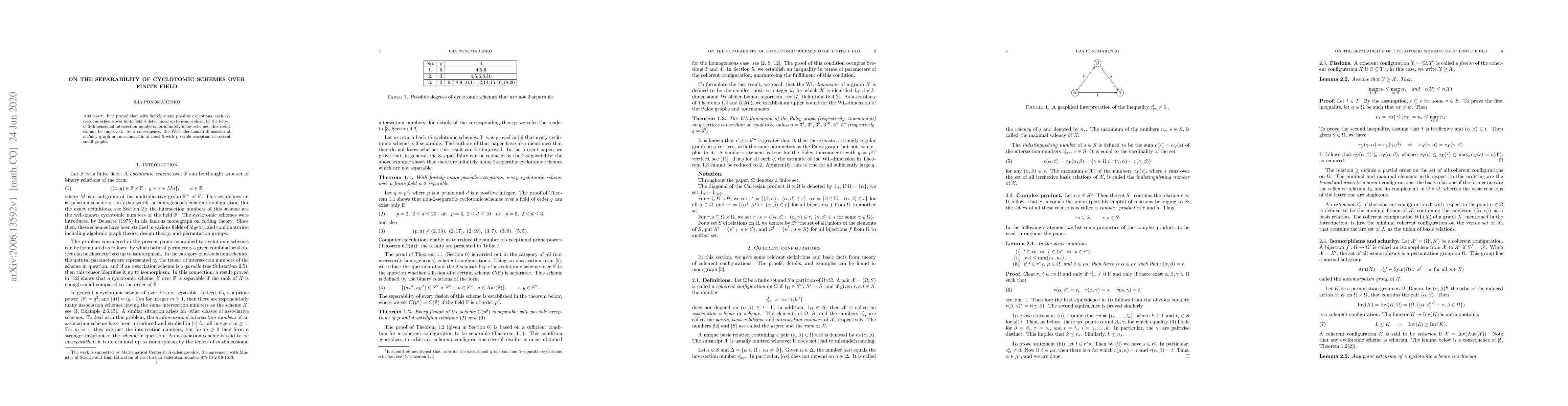 It is proved that with finitely many possible exceptions, each cyclotomic scheme over finite field is determined up to isomorphism by the tensor of 2-dimensional intersection numbers; for infinitely many schemes, this result cannot be improved. As a consequence, the Weisfeiler-Leman dimension of a Paley graph or tournament is at most 3 with possible exception of several small graphs.