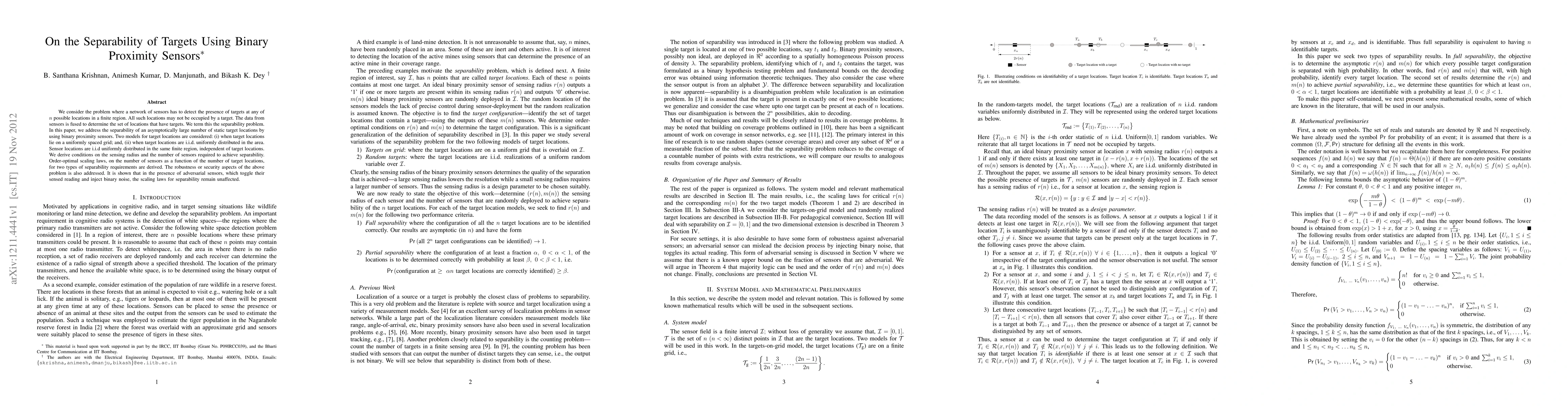 We consider the problem where a network of sensors has to detect the presence of targets at any of $n$ possible locations in a finite region. All such locations may not be occupied by a target. The data from sensors is fused to determine the set of locations that have targets. We term this the separability problem. In this paper, we address the separability of an asymptotically large number of static target locations by using binary proximity sensors. Two models for target locations are considered: (i) when target locations lie on a uniformly spaced grid; and, (ii) when target locations are i.i.d. uniformly distributed in the area. Sensor locations are i.i.d uniformly distributed in the same finite region, independent of target locations. We derive conditions on the sensing radius and the number of sensors required to achieve separability. Order-optimal scaling laws, on the number of sensors as a function of the number of target locations, for two types of separability requirements are derived. The robustness or security aspects of the above problem is also addressed. It is shown that in the presence of adversarial sensors, which toggle their sensed reading and inject binary noise, the scaling laws for separability remain unaffected.