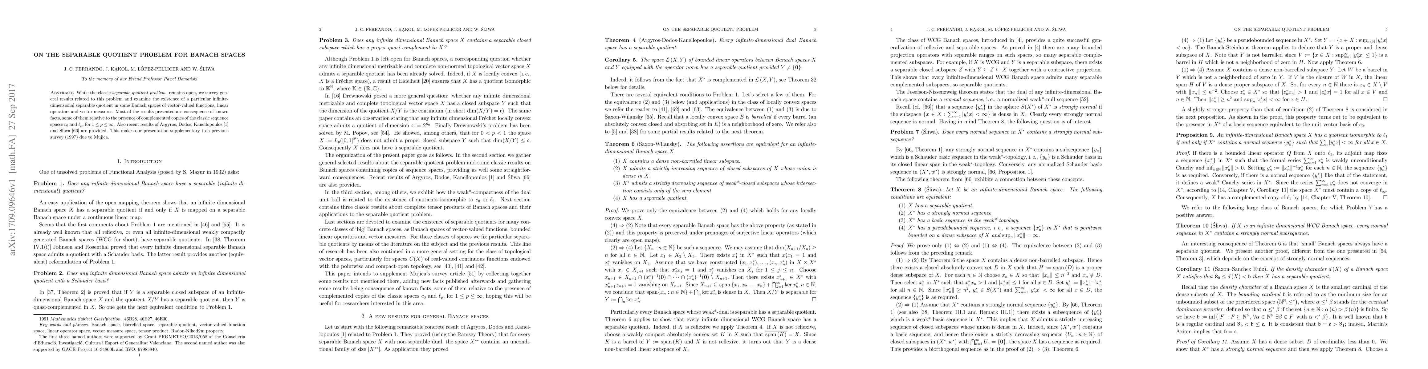 This paper surveys results on the separable quotient problem in Banach spaces, focusing on the existence of infinite-dimensional separable quotients in specific Banach spaces. It highlights the role of complemented copies of sequence spaces c_0 and l_p, and incorporates recent findings from Argyros, Dodos, Kanellopoulos, and Sliwa.