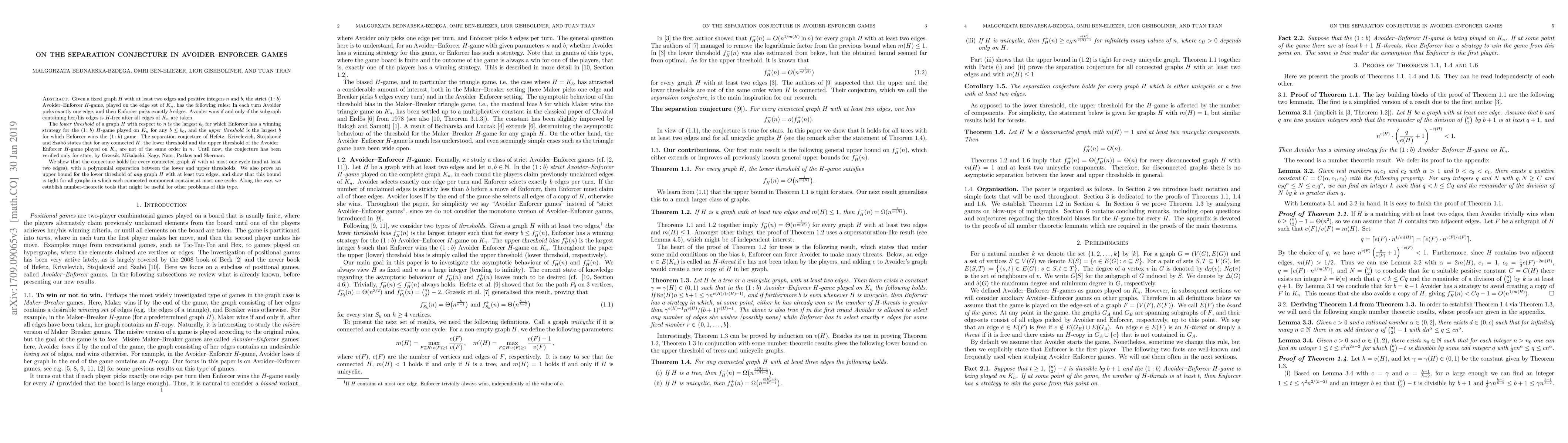 Given a fixed graph $H$ with at least two edges and positive integers $n$ and $b$, the strict $(1 \colon b)$ Avoider-Enforcer $H$-game, played on the edge set of $K_n$, has the following rules: In each turn Avoider picks exactly one edge, and then Enforcer picks exactly $b$ edges. Avoider wins if and only if the subgraph containing her/his edges is $H$-free after all edges of $K_n$ are taken. The lower threshold of a graph $H$ with respect to $n$ is the largest $b_0$ for which Enforcer has a winning strategy for the $(1\colon b)$ $H$-game played on $K_n$ for any $b \leq b_0$, and the upper threshold is the largest $b$ for which Enforcer wins the $(1 \colon b)$ game. The separation conjecture of Hefetz, Krivelevich, Stojakovi\'c and Szab\'o states that for any connected $H$, the lower threshold and the upper threshold of the Avoider-Enforcer $H$-game played on $K_n$ are not of the same order in $n$. Until now, the conjecture has been verified only for stars, by Grzesik, Mikala\v{c}ki, Nagy, Naor, Patkos and Skerman. We show that the conjecture holds for every connected graph $H$ with at most one cycle (and at least two edges), with a polynomial separation between the lower and upper thresholds. We also prove an upper bound for the lower threshold of any graph $H$ with at least two edges, and show that this bound is tight for all graphs in which each connected component contains at most one cycle. Along the way, we establish number-theoretic tools that might be useful for other problems of this type.