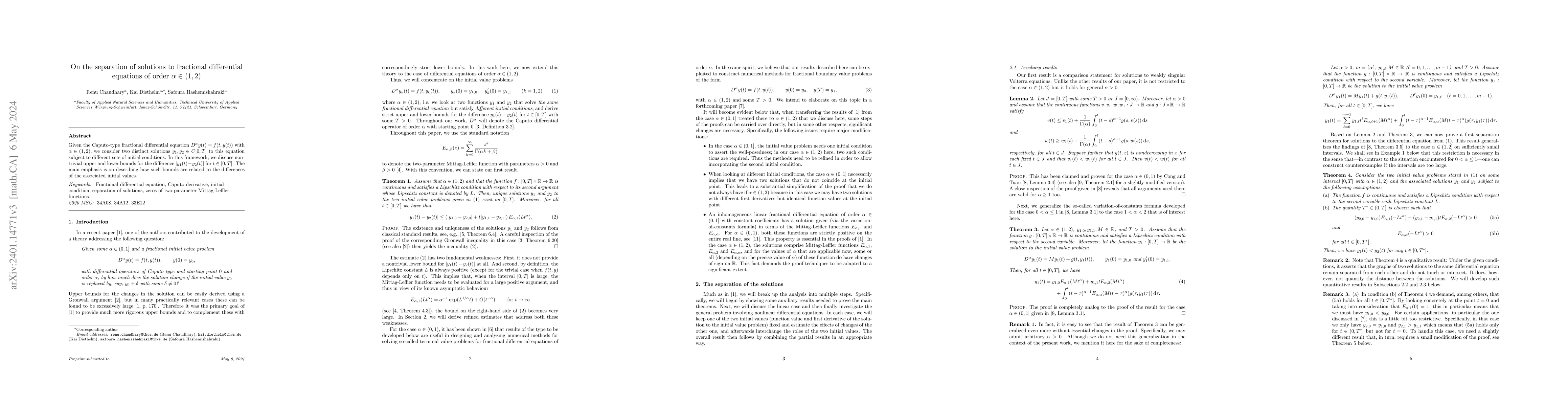 This paper investigates the separation of solutions for Caputo-type fractional differential equations with order $\alpha \in (1, 2)$ by establishing upper and lower bounds for the difference between two distinct solutions, which depend on the discrepancies in their initial conditions.