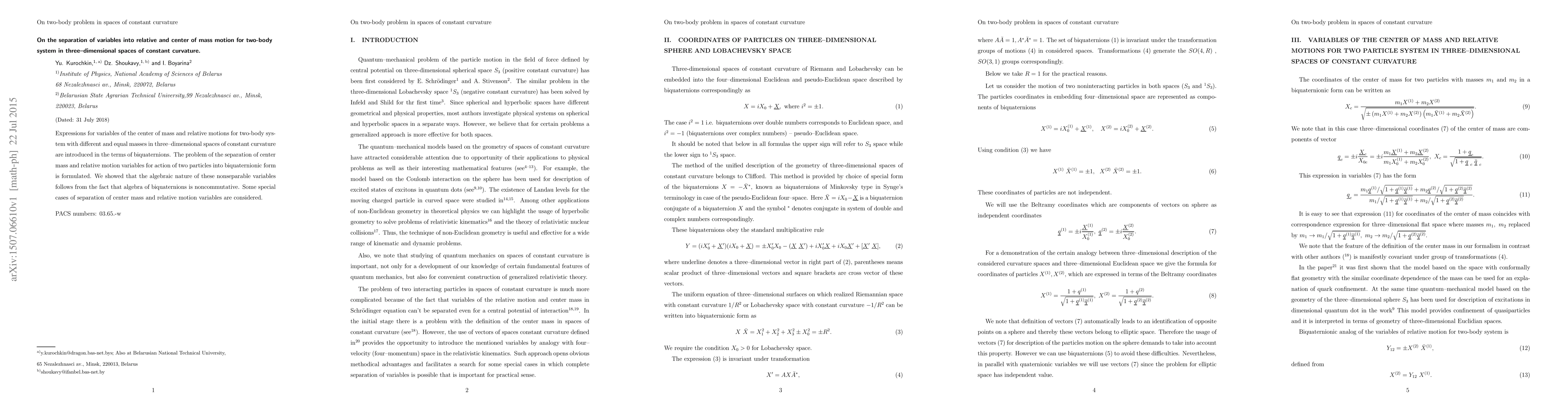 This paper introduces biquaternionic expressions for center of mass and relative motion in two-body systems within three-dimensional spaces of constant curvature. It demonstrates that the noncommutative nature of biquaternion algebra leads to the inherent nonseparability of these variables.