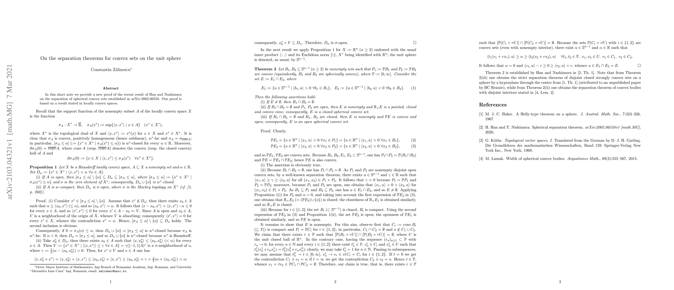 Summary: This paper presents a novel proof for Han and Nashimura's separation theorem on convex sets on the unit sphere, utilizing a result from locally convex spaces. The new approach aims to enhance the understanding of the separation properties of spherical convex sets.