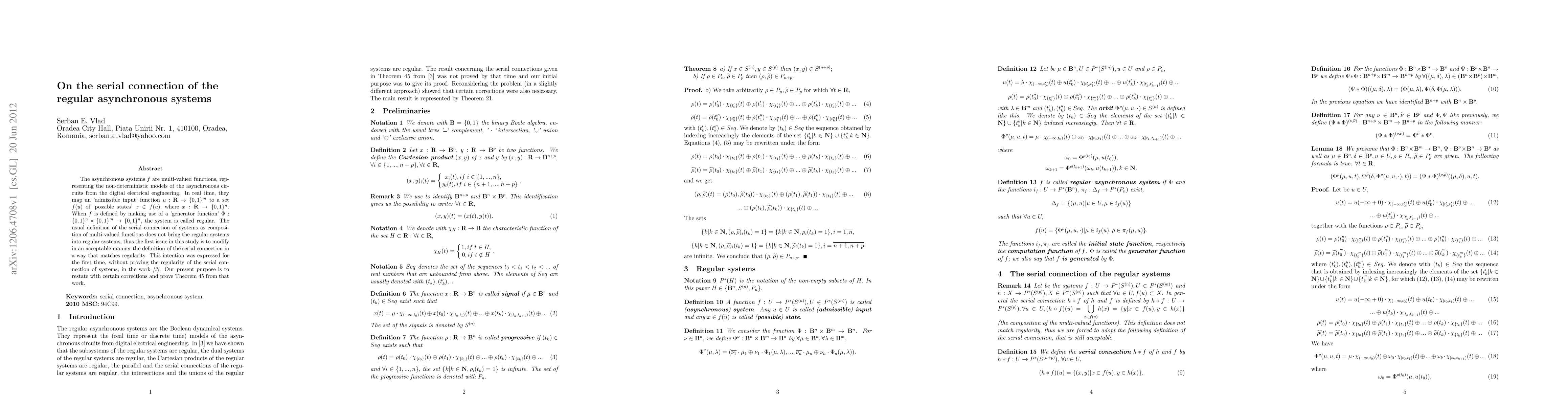 This paper addresses the issue of serial connection in regular asynchronous systems, proving that the modified definition preserves regularity. It corrects and restates previous findings, ensuring that such connections maintain the properties of regular systems in digital electrical engineering models.