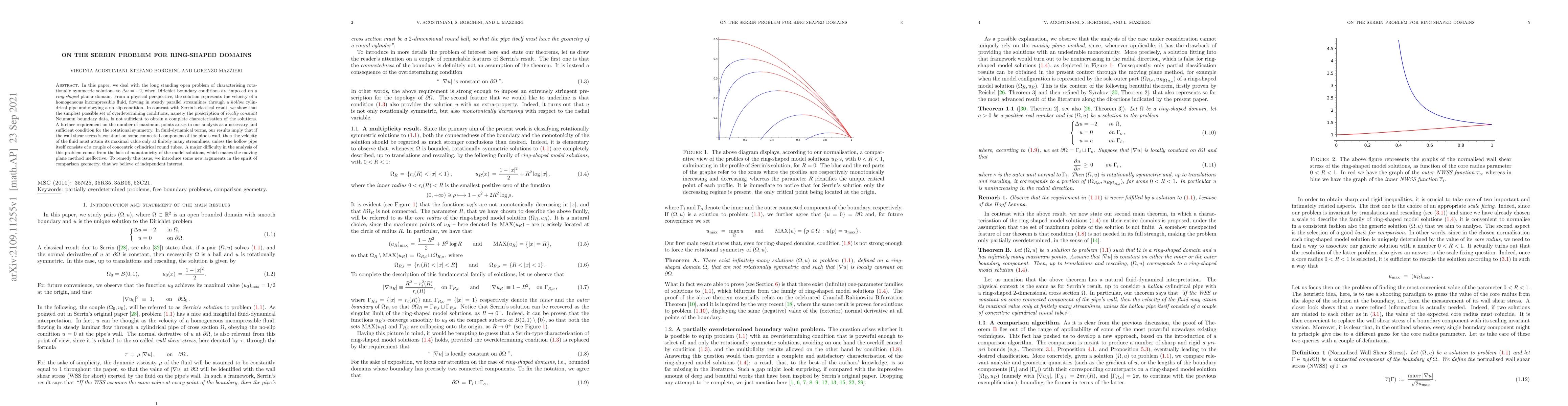 This paper addresses the Serrin problem for ring-shaped domains, focusing on rotationally symmetric solutions to a specific differential equation. Unlike Serrin's classical result, it shows that additional conditions are needed for a complete characterization, specifically concerning the number of maximum points. The study has fluid dynamics implications, suggesting that constant wall shear stress on a pipe's wall necessitates finite maxima in fluid velocity along streamlines, except in the case of concentric cylindrical tubes. The analysis overcomes difficulties posed by non-monotonic model solutions through novel comparison geometry arguments.