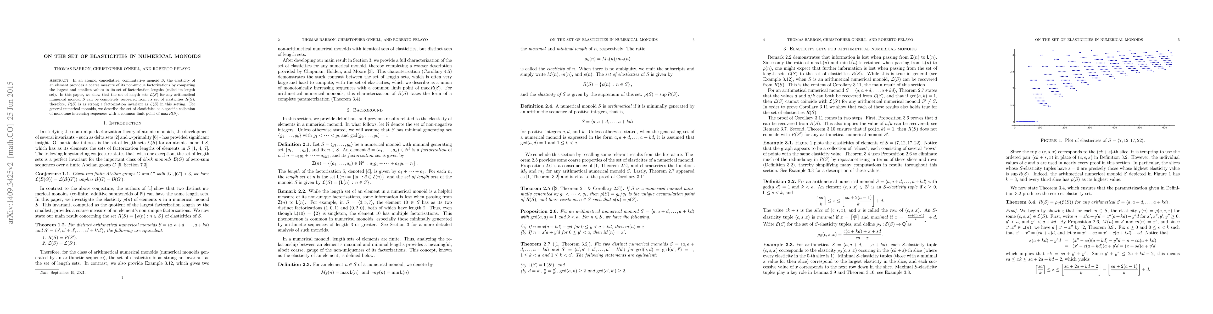In an atomic, cancellative, commutative monoid $S$, the elasticity of an element provides a coarse measure of its non-unique factorizations by comparing the largest and smallest values in its set of factorization lengths (called its length set). In this paper, we show that the set of length sets $\mathcal L(S)$ for any arithmetical numerical monoid $S$ can be completely recovered from its set of elasticities $R(S)$; therefore, $R(S)$ is as strong a factorization invariant as $\mathcal L(S)$ in this setting. For general numerical monoids, we describe the set of elasticities as a specific collection of monotone increasing sequences with a common limit point of $\max R(S)$.