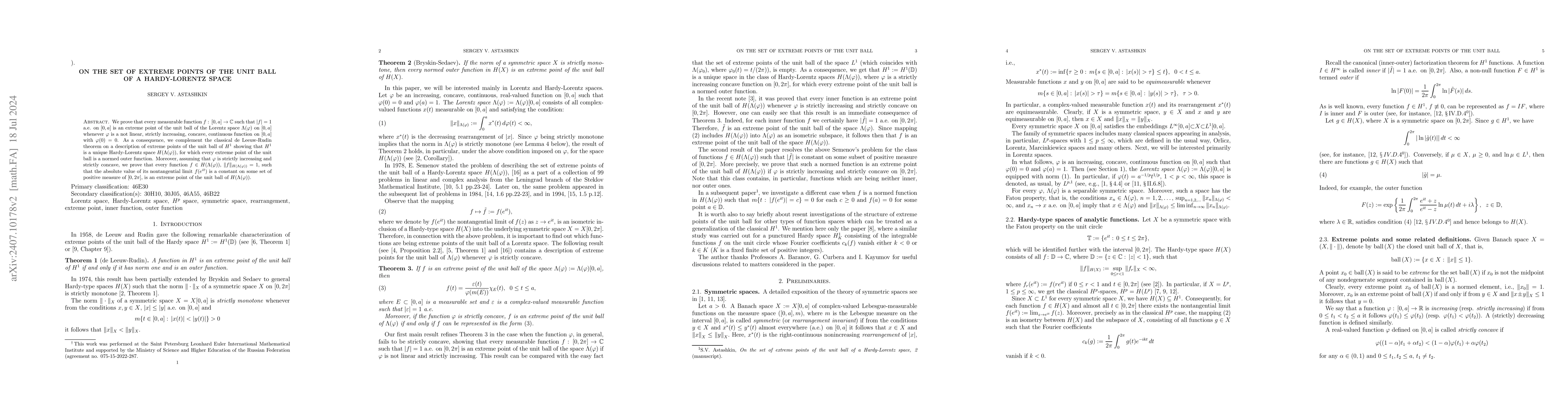 This paper demonstrates that functions with constant modulus almost everywhere are extreme points in the unit ball of a Hardy-Lorentz space under specific conditions on the function φ. It extends the classical de Leeuw-Rudin theorem for $H^1$ by identifying $H^1$ as a unique Hardy-Lorentz space where every unit ball extreme point is a normed outer function.