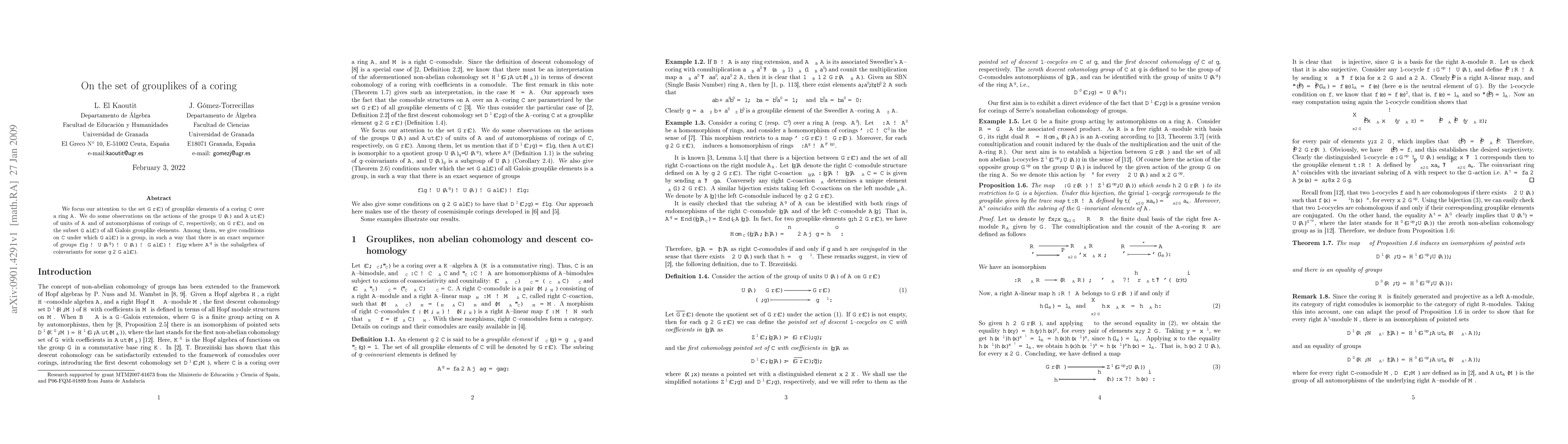 The paper focuses on the set of grouplike elements $\gl{\coring{C}}$ of a coring $\coring{C}$ over a ring $A$, examining the actions of $U(A)$ and $\aut{\coring{C}}$ on $\gl{\coring{C}}$ and the subset $\galois{\coring{C}}$. It provides conditions under which $\galois{\coring{C}}$ forms a group with an exact sequence involving $U(A^g)$ and $U(A)$.