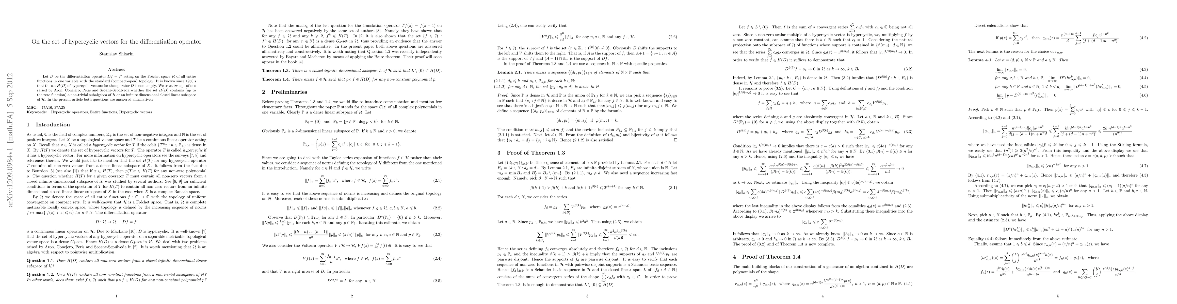 A recent study confirms that the set of hypercyclic vectors for the differentiation operator contains a non-trivial subalgebra and an infinite dimensional closed linear subspace of entire functions.