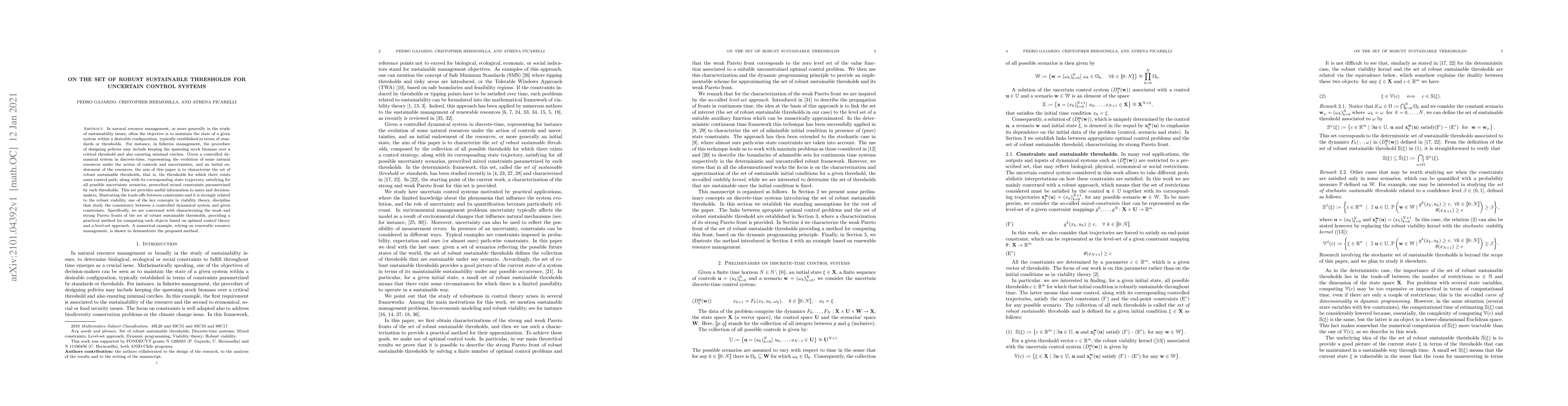 This paper explores the characterization of robust sustainable thresholds for controlled dynamical systems under uncertainty, focusing on natural resource management. It introduces methods to determine the set of thresholds that ensure system viability across all uncertainty scenarios, employing optimal control theory and a level-set approach to compute the weak and strong Pareto fronts.