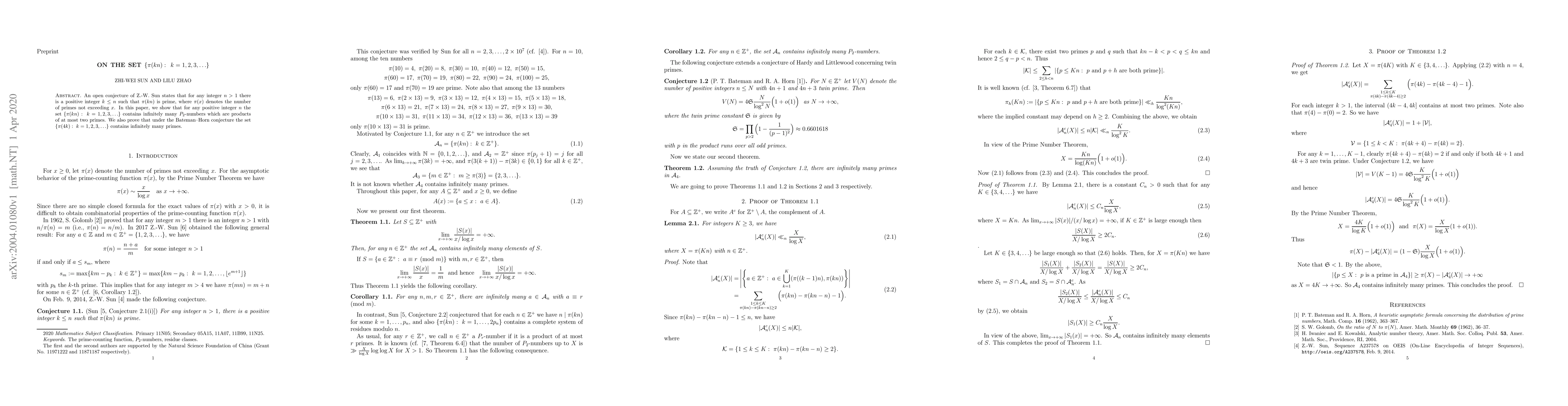 An open conjecture of Z.-W. Sun states that for any integer $n>1$ there is a positive integer $k\le n$ such that $\pi(kn)$ is prime, where $\pi(x)$ denotes the number of primes not exceeding $x$. In this paper, we show that for any positive integer $n$ the set $\{\pi(kn):\ k=1,2,3,\ldots\}$ contains infinitely many $P_2$-numbers which are products of at most two primes. We also prove that under the Bateman--Horn conjecture the set $\{\pi(4k):\ k=1,2,3,\ldots\}$ contains infinitely many primes.