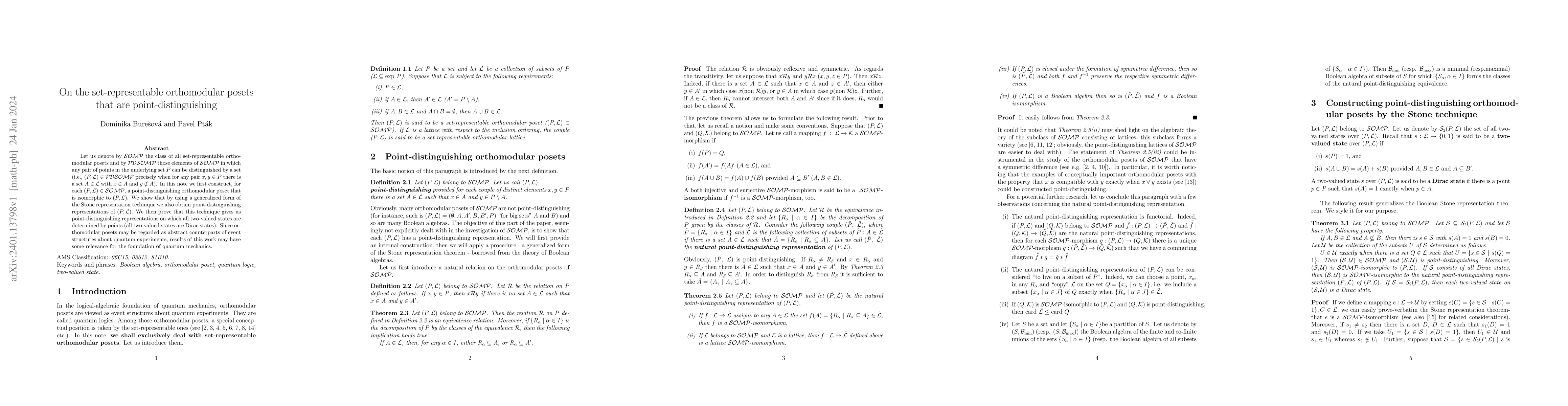 This paper constructs point-distinguishing representations for set-representable orthomodular posets using a generalized Stone representation technique, proving that all two-valued states are determined by points, which may have implications for the foundations of quantum mechanics.