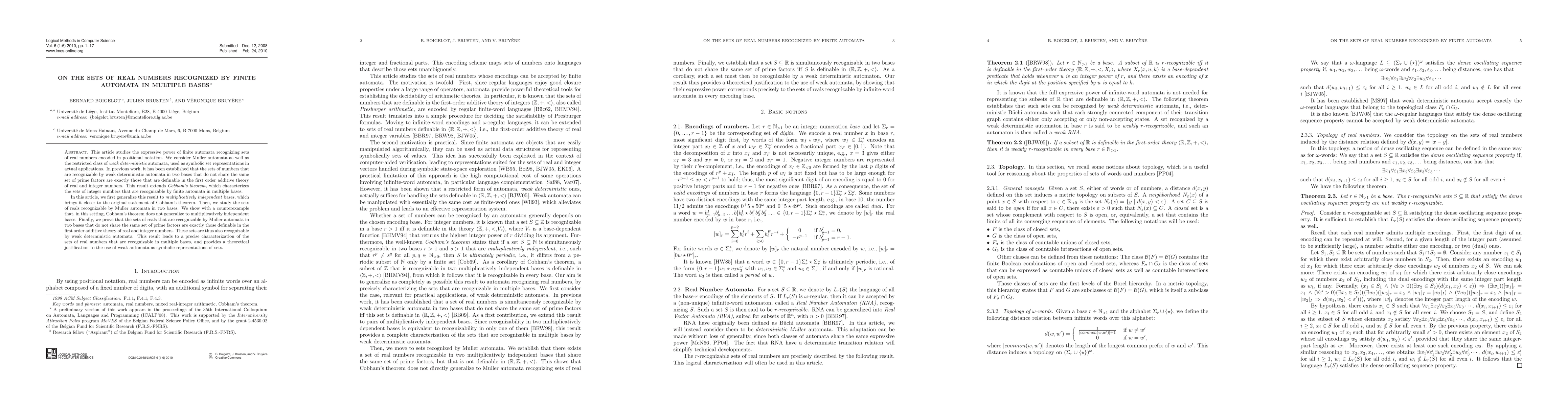 The paper studies finite automata's expressive power in recognizing sets of real numbers encoded in multiple bases, generalizing a previous result on integer numbers to multiplicatively independent bases.