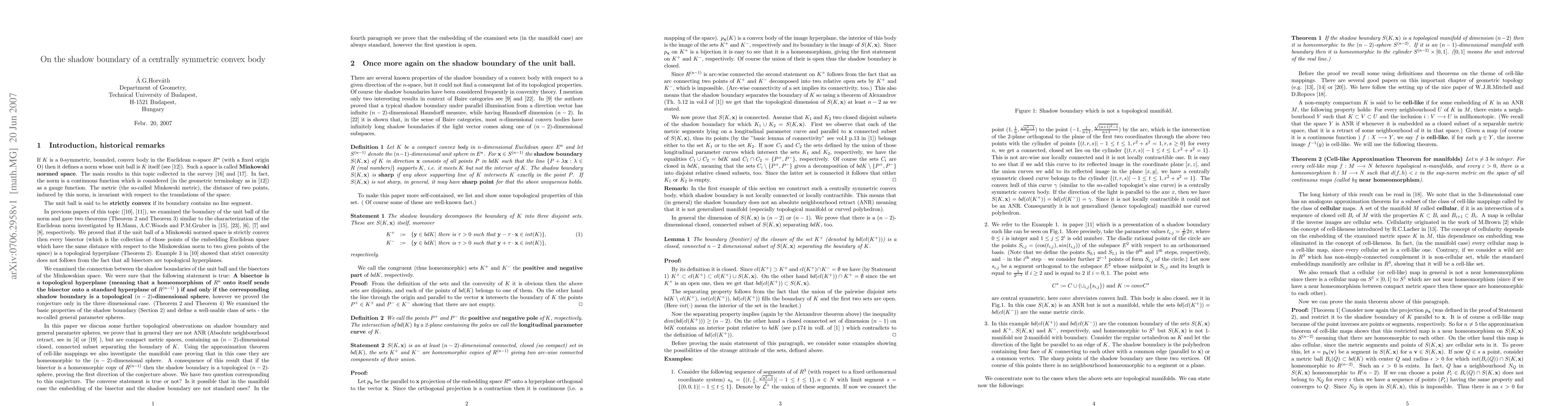 This paper explores the shadow boundary of a centrally symmetric convex ball in n-dimensional space, proving it's a topological manifold when non-degenerated general parameter spheres are. It also establishes that the bisector is homeomorphic to R^(n-1) if these spheres are (n-2)-manifolds, implying the shadow boundary is a topological (n-2)-sphere in such cases.