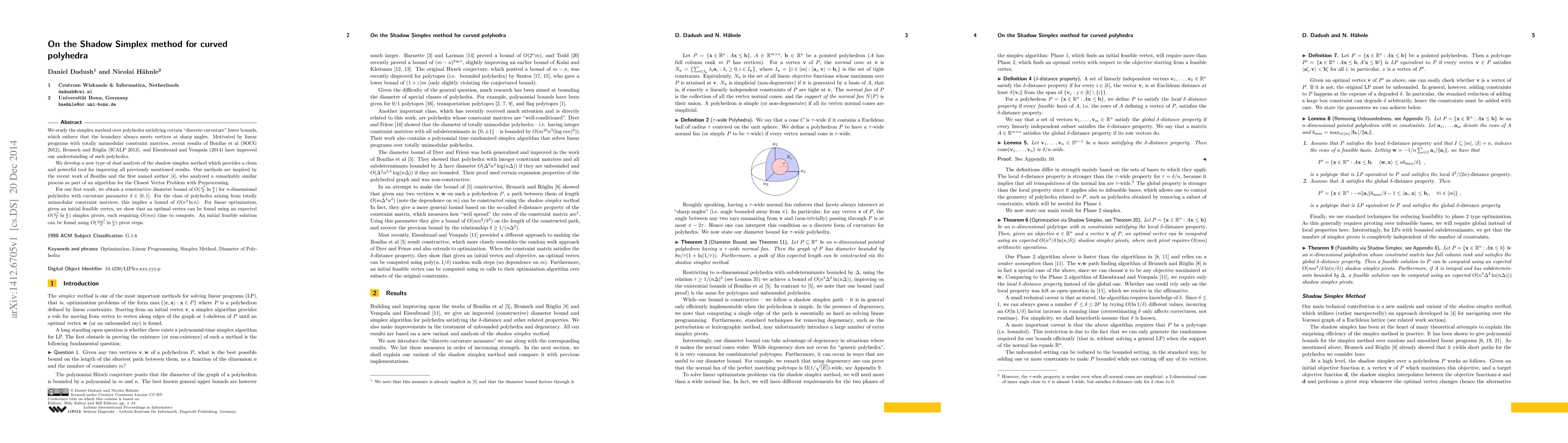 This paper introduces a new dual analysis of the shadow simplex method for polyhedra with discrete curvature lower bounds, improving previous results on linear programs with totally unimodular constraint matrices. The authors provide a constructive diameter bound and show that an optimal vertex can be found in expected $O(\frac{n^3}{\delta} \ln \frac{n}{\delta})$ pivots.