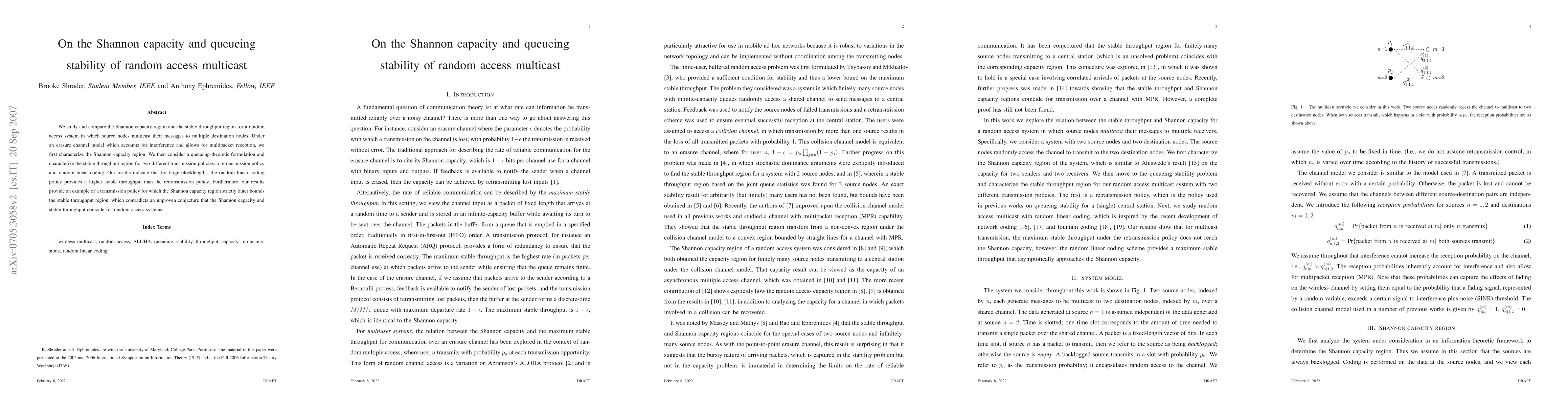 This paper compares the Shannon capacity region and stable throughput region for a random access multicast system under an erasure channel model. It finds that random linear coding achieves higher stable throughput than retransmission, and provides evidence that the Shannon capacity region can exceed the stable throughput region, challenging a conjecture about their equivalence.