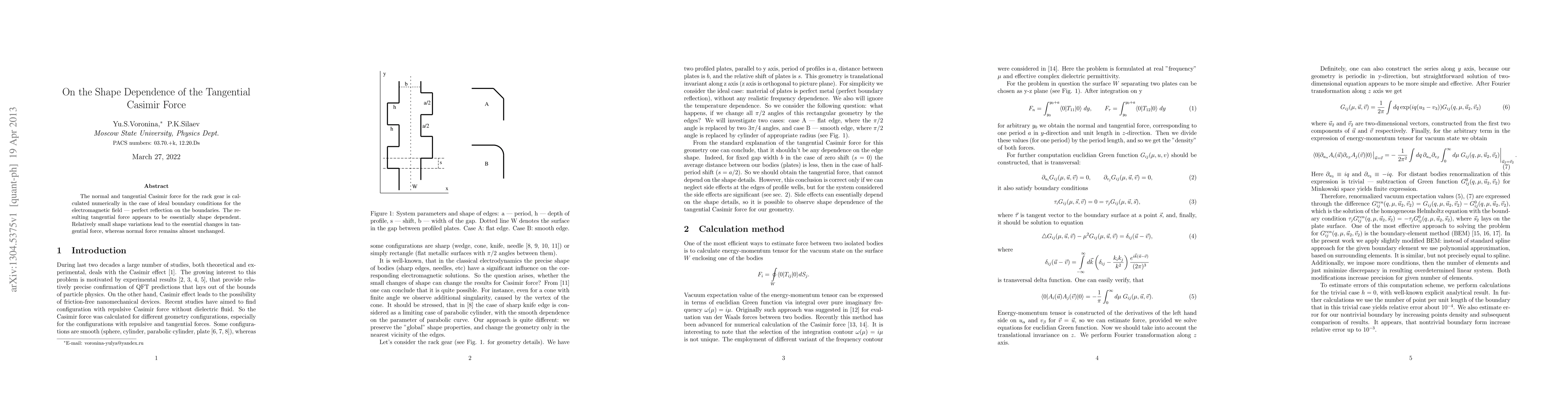 This paper numerically calculates the normal and tangential Casimir forces for a rack gear under ideal boundary conditions, revealing that the tangential force is significantly shape-dependent while the normal force remains largely unaffected by small shape variations.