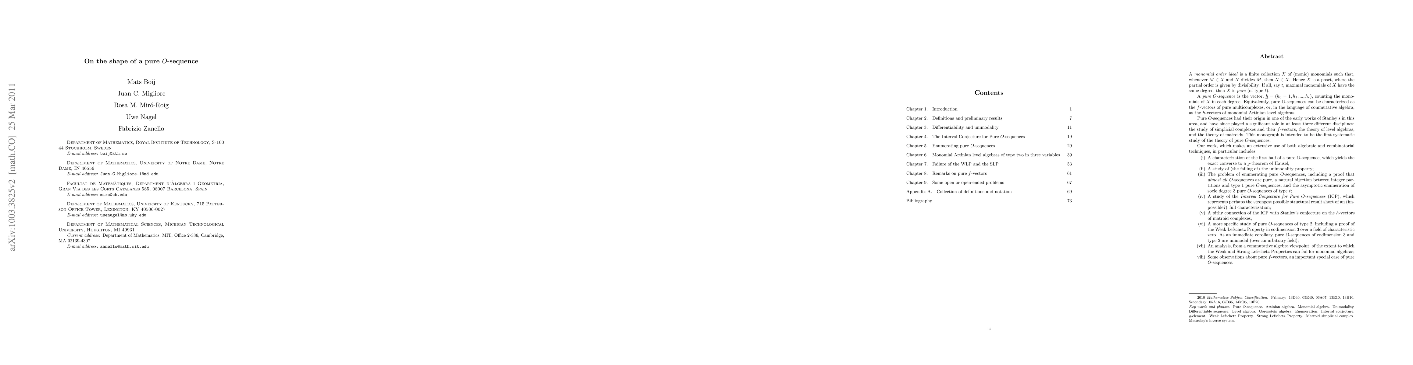 This paper provides a comprehensive study on pure O-sequences, characterized by the vector counting monomials of a poset in each degree. It explores their properties, including unimodality, enumeration, and connections to algebraic and combinatorial structures, proving significant results such as the Weak Lefschetz Property in codimension 3.