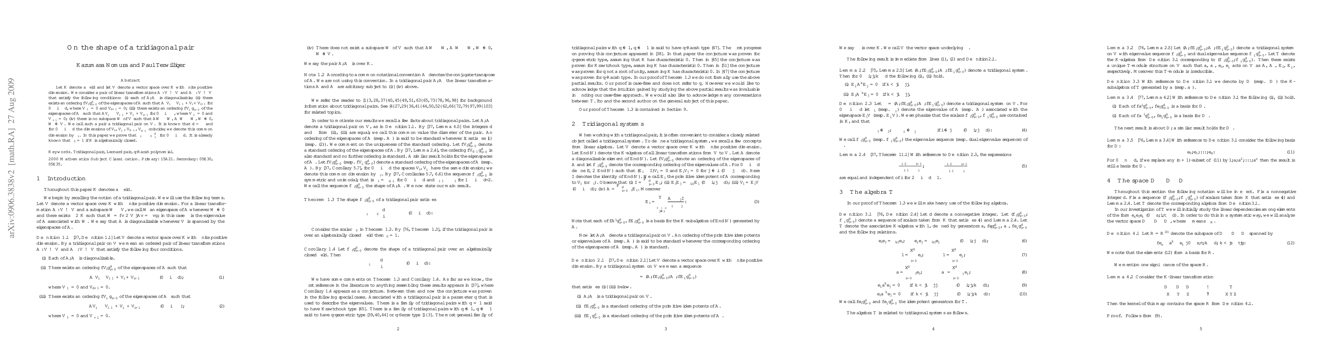 Let $K$ denote a field and let $V$ denote a vector space over $K$ with finite positive dimension. We consider a pair of linear transformations $A:V \to V$ and $A^*:V \to V$ that satisfy the following conditions: (i) each of $A,A^*$ is diagonalizable; (ii) there exists an ordering $\lbrace V_i\rbrace_{i=0}^d$ of the eigenspaces of $A$ such that $A^* V_i \subseteq V_{i-1} + V_{i} + V_{i+1}$ for $0 \leq i \leq d$, where $V_{-1}=0$ and $V_{d+1}=0$; (iii) there exists an ordering $\lbrace V^*_i\rbrace_{i=0}^\delta$ of the eigenspaces of $A^*$ such that $A V^*_i \subseteq V^*_{i-1} + V^*_{i} + V^*_{i+1}$ for $0 \leq i \leq \delta$, where $V^*_{-1}=0$ and $V^*_{\delta+1}=0$; (iv) there is no subspace $W$ of $V$ such that $AW \subseteq W$, $A^* W \subseteq W$, $W \neq 0$, $W \neq V$. We call such a pair a {\it tridiagonal pair} on $V$. It is known that $d=\delta$ and for $0 \leq i \leq d$ the dimensions of $V_i$, $V^*_i$, $V_{d-i}$, $V^*_{d-i}$ coincide; we denote this common dimension by $\rho_i$. In this paper we prove that $\rho_i \leq \rho_0 \binom{d}{i}$ for $0 \leq i \leq d$. It is already known that $\rho_0=1$ if $\K$ is algebraically closed.