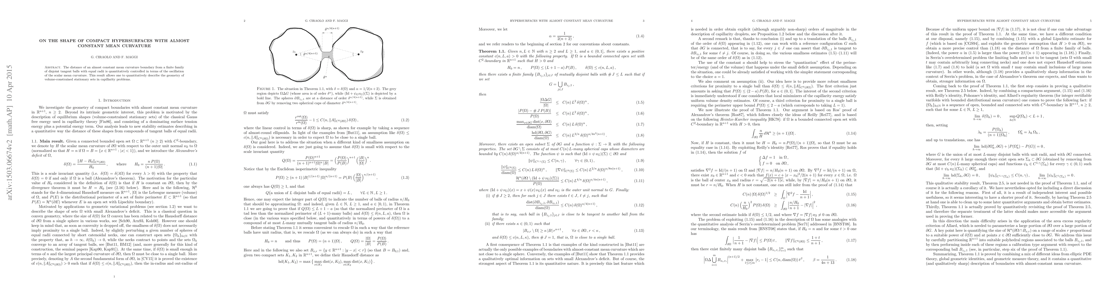 The distance of an almost constant mean curvature boundary from a finite family of disjoint tangent balls with equal radii is quantitatively controlled in terms of the oscillation of the scalar mean curvature. This result allows one to quantitatively describe the geometry of volume-constrained stationary sets in capillarity problems.
